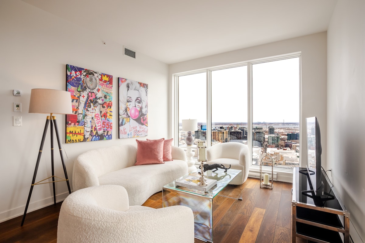 Indulge in refined city living from this exceptional upper-level 2-bedroom, 2-bathroom residence, ideally located in the very heart of downtown Montreal. Elevated high above the streets below, the apartment showcases spectacular panoramic views, elegant contemporary styling, and thoughtfully curated finishes throughout. Designed for discerning guests, it offers a seamless blend of sophistication and comfort, equally suited for executive stays and upscale urban getaways.