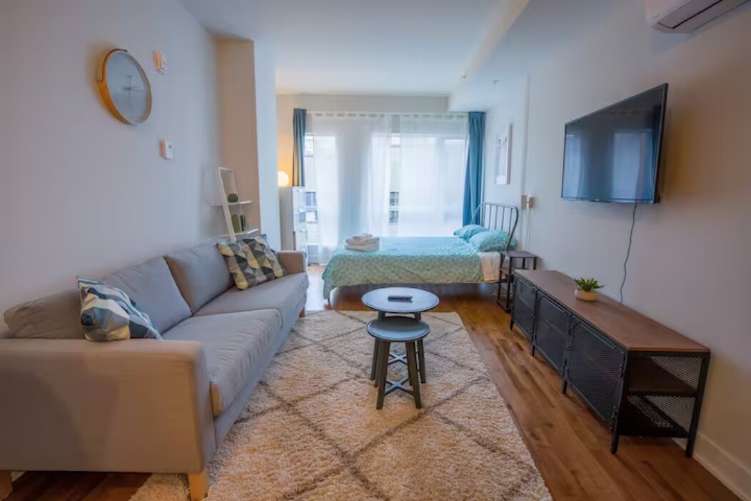 Welcome to our stunning modern suite in the heart of downtown Montreal, just steps from the Old Port! This stylish suite boasts a sophisticated open-concept design, high-end finishes, and a fully equipped kitchen perfect for home-cooked meals. Relax in the luxurious bedrooms with plush bedding and unwind in the elegant living space. With top restaurants, boutiques, and nightlife at your doorstep, experience the perfect blend of comfort and city excitement!