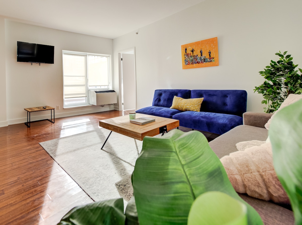 This bright, minimalist Scandinavian-style 3-bedroom apartment is perfect for groups of travelers. Set in a fully restored historic building, it’s just steps from the Museum of Fine Arts, Mont-Royal Park, and the Bell Centre, with fantastic dining and cultural spots nearby. Guy-Concordia Metro is less than 5 minutes away, making it easy to explore the city. The condo also offers a lounge and gym and free laundry. For larger groups, additional apartments are available.