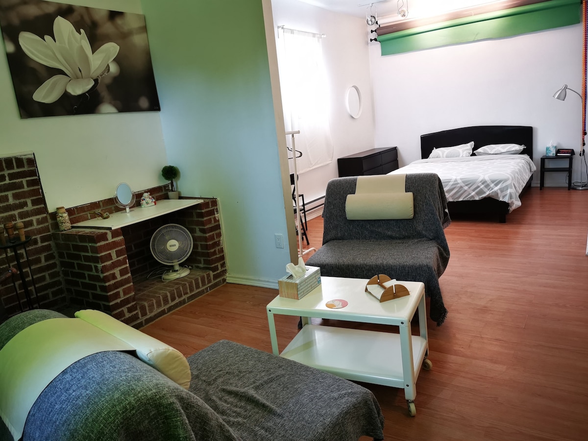 Charmant studio situé dans un environnement calme et champêtre, près de toutes les facilités et pouvant confortablement accueillir 2 adultes. - Entrée partagée - Jolie terrasse - Accès à la piscine extérieure chauffée (mai à octobre) - Cuisine fonctionnelle et complètement équipée - Salle de bain avec douche et laveuse-sécheuse - Chambre à coucher confortable. Lit Queen - Station de Métro à 100 mètres - Plusieurs commerces à quelques minutes de marche