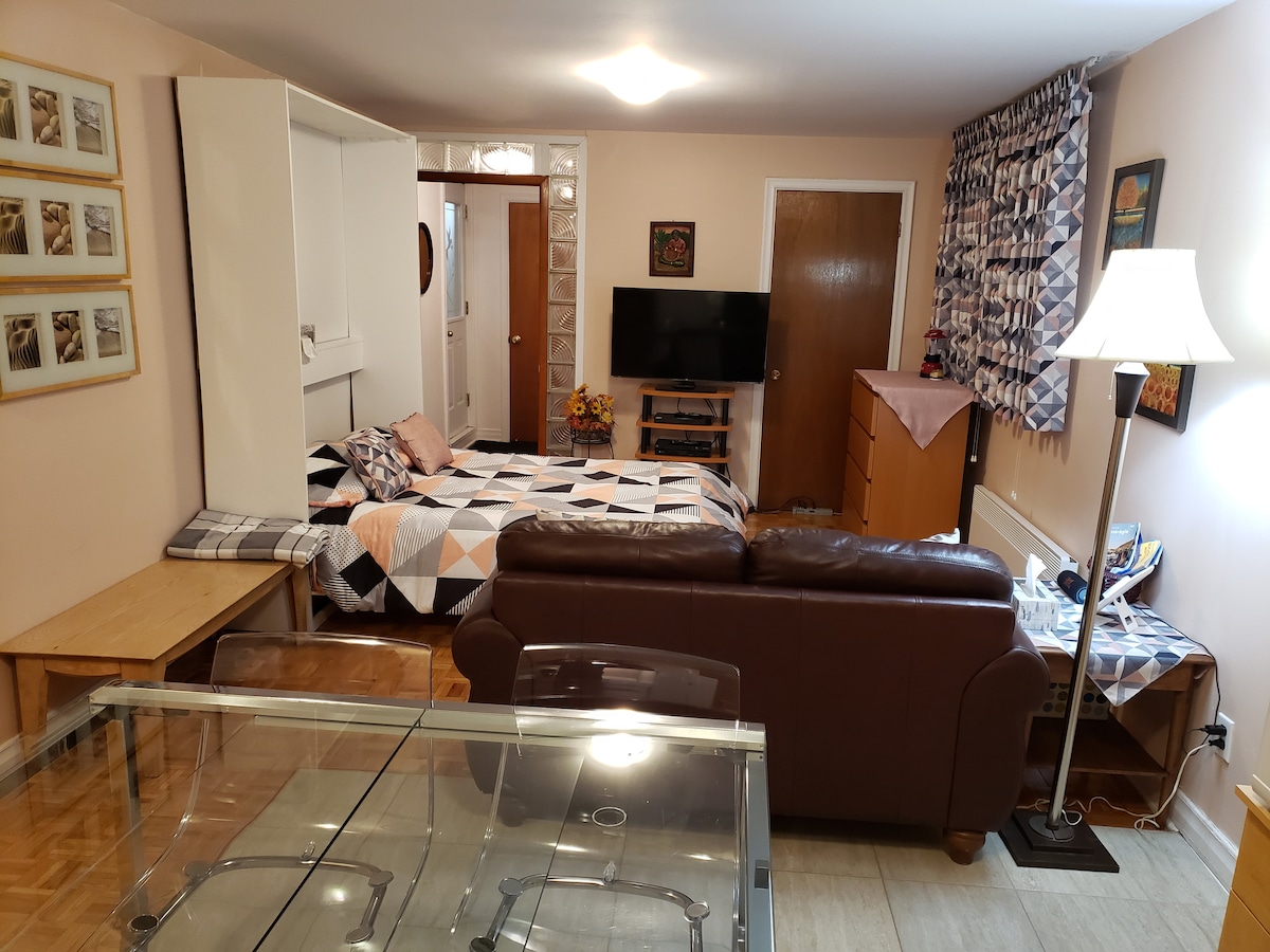 Studio with double bed, small kitchen, private bathroom and private entrance to the appartment. Really nice neighborhood, 10 min walk from the metro station Jolicoeur, which is at 8 stations from downtown (15 min). Really nice and welcoming. Half basement. The staircase is not very large (little smaller than regular stairs). The ceiling is lower than normal, 6 feet 7 inches (2 meters). Not suitable for more than 2 people! Perfect for short stay.