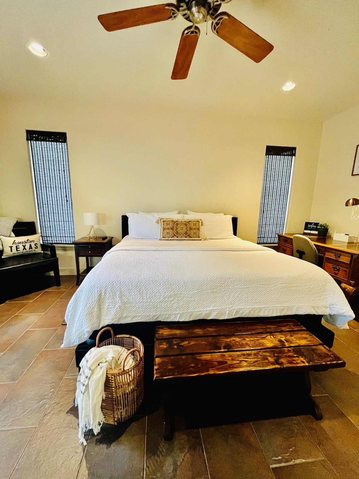 Welcome to this cozy& stylish upper-level guesthouse! Designed with comfort in mind, this compact 400sqft space features hotel-quality King bed with ensuite bathroom, a full kitchen, living room &laundry unit for your convenient stay. Located in lovely neighborhood with great central location: TX Med Center, NRG stadium,Rice Village,Galleria,Museum District, Upper Kirby,Montrose,River Oaks,Midtown/Downtown Free curbside street parking Shared outdoor space with lounge chairs in a cute garden.