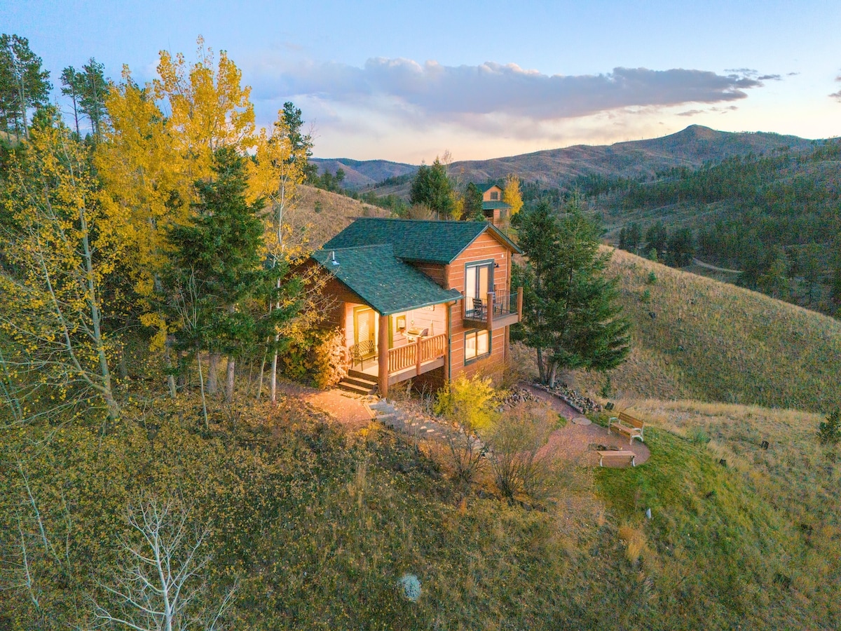 Architecturally Interesting Contemporary Mountain 4 BDRM home conveniently located just 2 Exits North on I-25 from the US Air Force Academy and near 6+ wedding venues. An ideal setting for entertaining/hosting your family and friends for a special event or get-away that feels like a 4-star resort! Enjoy the decks & firepits, relax in a hammock or soak in the hot tub. Hosting your special getaway is a breeze in the gourmet kitchen. Put out the corn hole or go for a hike on a beautiful day.
