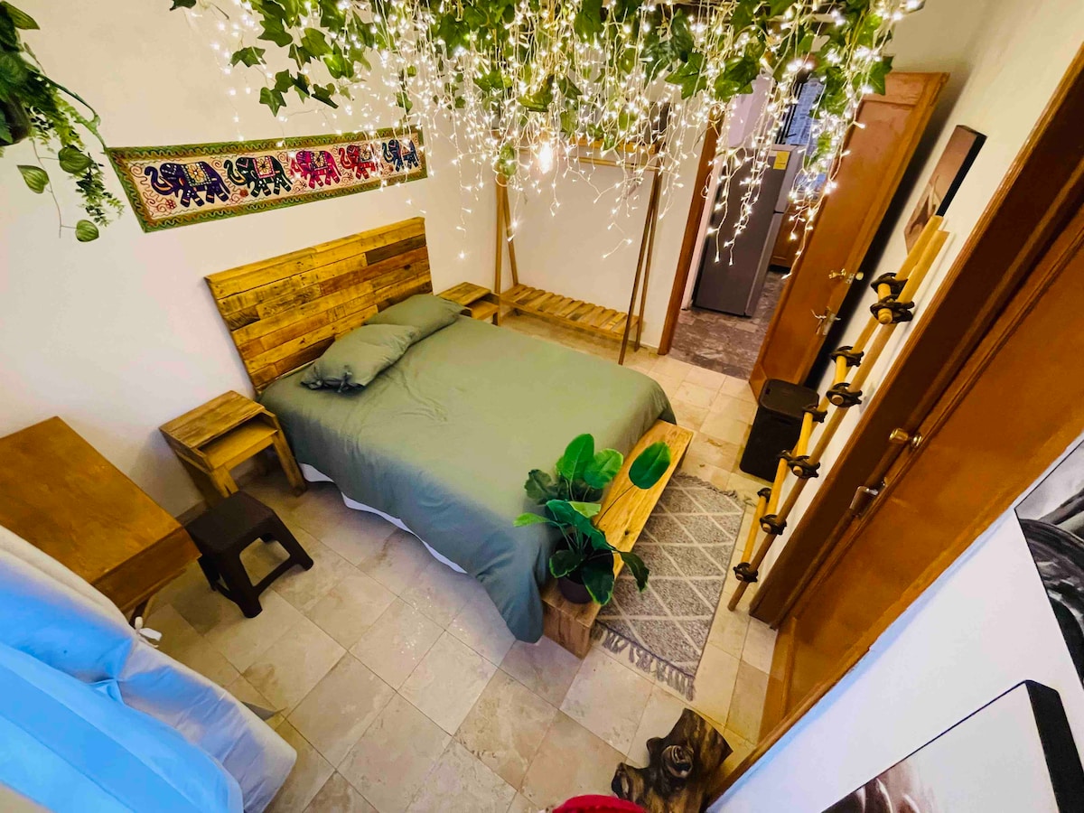 Push open folding big doors first thing in the morning and step onto a green patio for a blast of fresh air and daylight. The big floor to ceiling doors keeps the apt ventilated and fresh. High ceilings with clay and wood beams, bunch of light, and artesanal tiles and wood floor. The place is silent, carefully decorated, very nice for work or just to be here. This new one: https://www.airbnb.mx/rooms/1604605046335668118?guests=1&adults=1&s=67&unique_share_id=4dd1b1c9-fc93-4c94-9ca1-c91cd0256dae