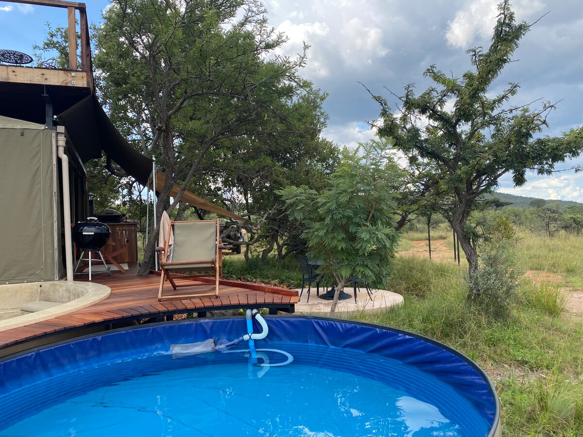 The luxury tent is in the heart of the Waterberg bushveld on Newburg farm at Elements Golf Reserve. Enjoy watching wildlife, including buffalo, sable, kudu and other plains game from the privacy of your patio. A unique luxury glamping experience, with all the comforts of home. The tent is fully equipped for self-catering with kitchenette and built-in braai. The tent sleeps 4 guests and is wheelchair friendly. TV and full DSTV. Situated approximately 200m from a private access gate to Elements.