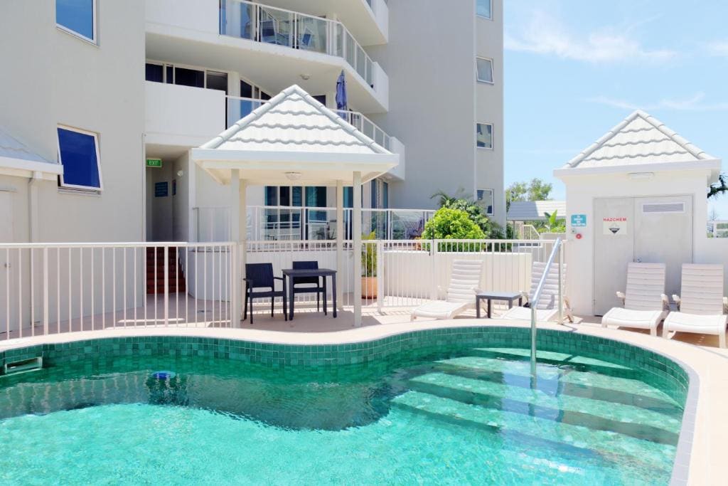 Directly across from stunning Mooloolaba beach on the beautiful Sunshine Coast. Enjoy fabulous views, the sound of the waves and cool breezes from the private balcony. Our self contained 1 bedroom, 1 bathroom apartment has been recently renovated with free secure underground parking, lift access, a pool to enjoy after a day at the beach with a spacious BBQ and entertainment area.