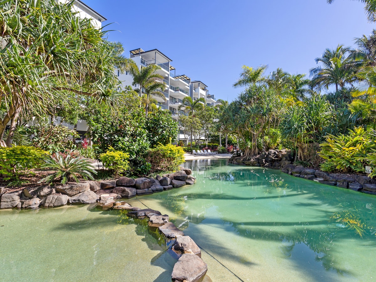Largest lagoon pool,hot pools, spas on the coast ! cosy one bedroom unit Suited for couples 2 adults and up to 2 children. Two person deep bath and shower combo.! The sofa bed is suitable for children only. full kitchen,OCEAN VEIWS! .situated 100metres from beach and walking distance to moloolaba. restaurants right at your door step, pizza,sushi, and Alex surf club 1 minute walk.watersides,play area for children, gym,free use of BBQ's skate park accross the road,it's a beautiful oasis to relax.