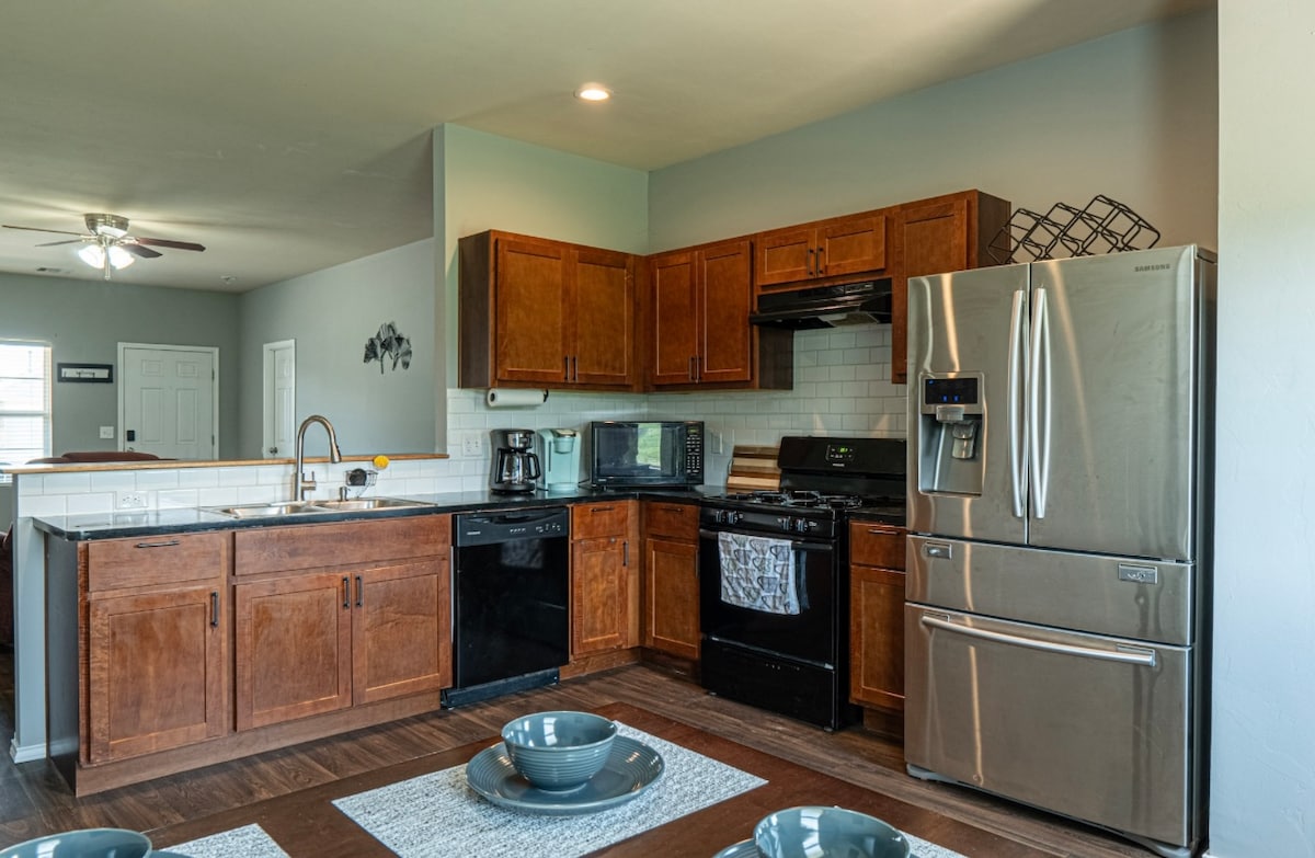 Open living area with fireplace and cozy atmosphere. The Kitchen is well stocked with large and small appliances including air fryer and coffee maker. Master bedroom has a King size bed. All bedrooms have top quality Pillows and Mattresses with pressed quality linens as well as pillow and mattress protectors for cleanliness and health for guests. All bedrooms have chests/dressers, walk-in closets and TV's. Home also has 2 full bathrooms as well as full size washer/dryer in the utility room.