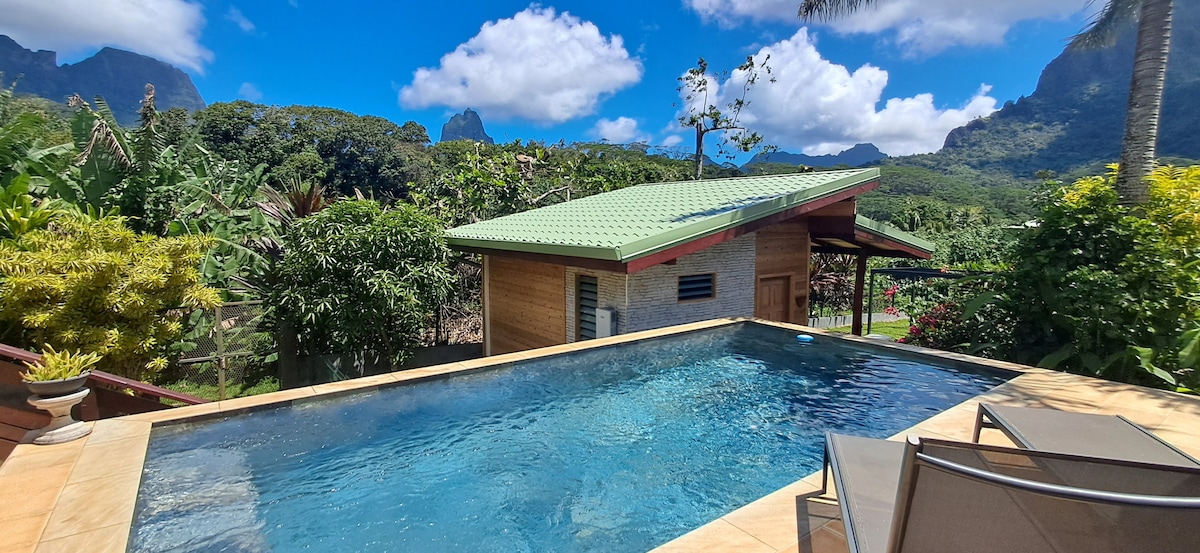 Petite maison lumineuse au pied du mont ROTUI situé au cœur de Moorea sur la route des ananas. L’emplacement est idéal pour découvrir la montagne. La chambre climatisée et équipée d’un lit double vous accueillent dans une ambiance sereine et douce. La maison dispose d’une piscine privée et d’une terrasse extérieure avec pergola. Un barbecue est également disponible. À proximité de la plupart des activités de montagne (randonné, VTT) et proche de toute commodité : supermarché, restaurant, plage