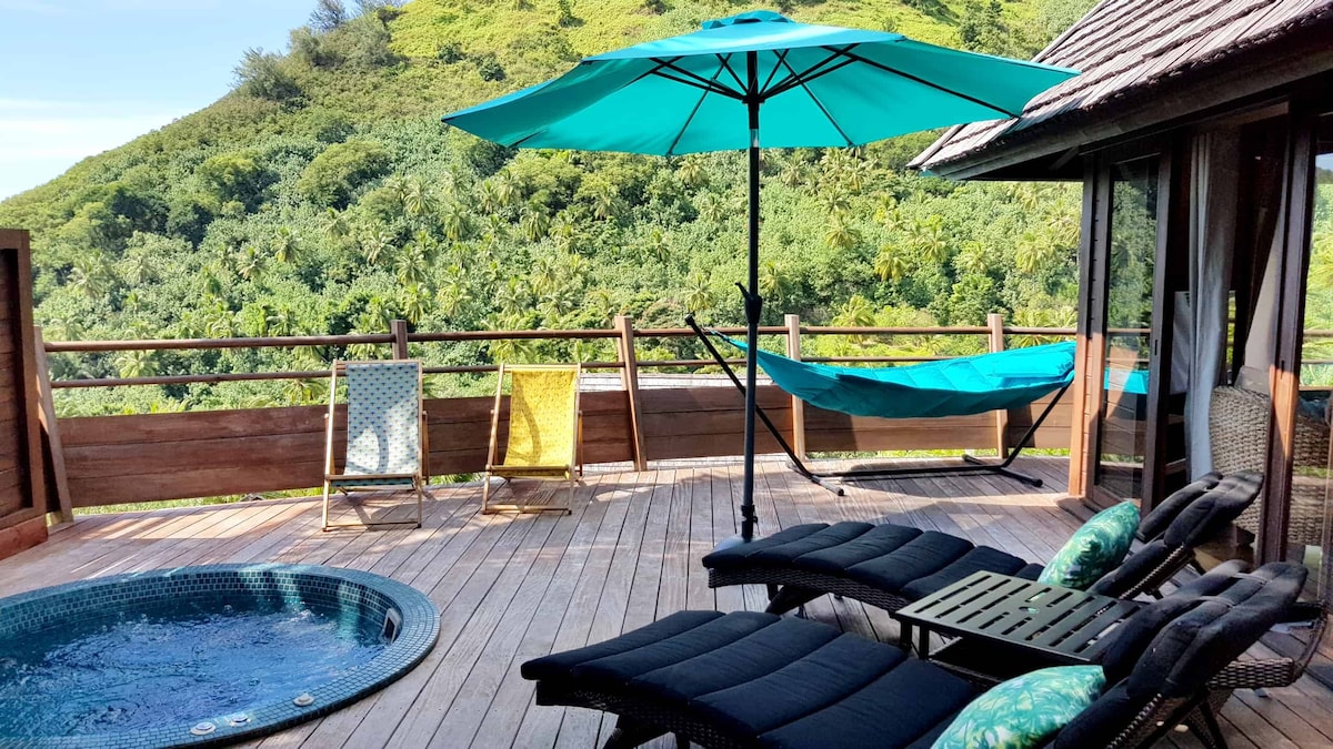 Welcome to your peaceful retreat in paradise! This spacious 100 m² villa with a private terrace and jacuzzi is the perfect spot to relax, surrounded by lush greenery and overlooking the lagoon. Each evening, enjoy breathtaking sunsets in a serene and exotic setting. Inspired by neo-Polynesian architecture, the villa blends local charm with modern comfort to offer you an unforgettable stay.