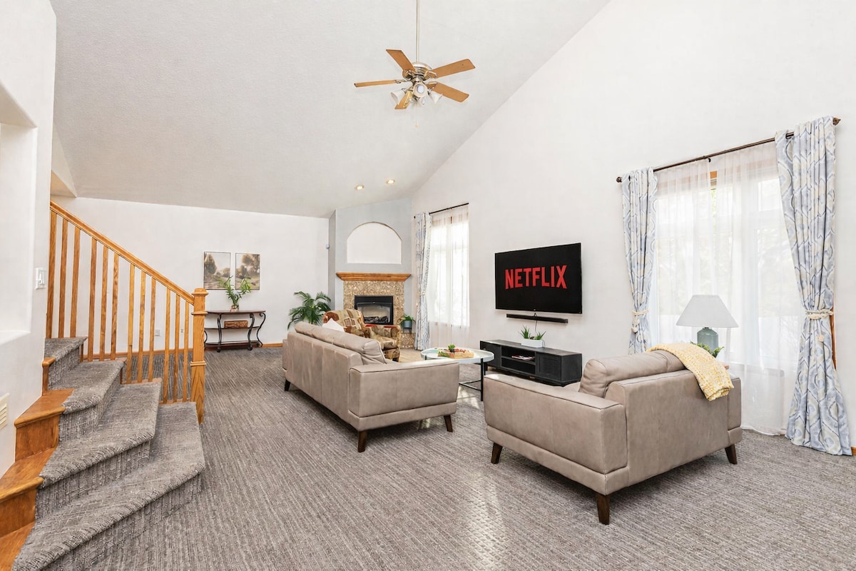 A cozy retreat for families to unwind. This space features 2 bedrooms, 2 bathrooms, and a fully equipped kitchen, making it ideal for hosting multiple guests. You'll find plenty of areas to relax. The Space: The downstairs bedrooms include a queen bed and a full bed, each with a spacious closet. There's also a projector, perfect for fun movie nights. Upstairs, you'll find a kitchen with a dining table that seats 8, along with a welcoming living area complete with a TV for everyone to enjoy.