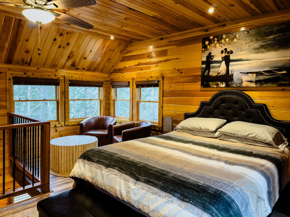 Privacy and comfort are yours when you stay in this spacious four season cabin which offers 3 bedrooms, 2 bathrooms with its own private ponds. The cabin is supplied with linens, towels, well equipped kitchen, A/C, WiFi, screened in porch, cozy rock fireplace, picnic table, fire pit, grill and beautiful scenery. The rate includes up to 2 guests, each additional guest is $35.00/night. Pets are welcomed for a fee of $20 per pet per day(maximum of 2) and campfire wood is available $5 a bundle.