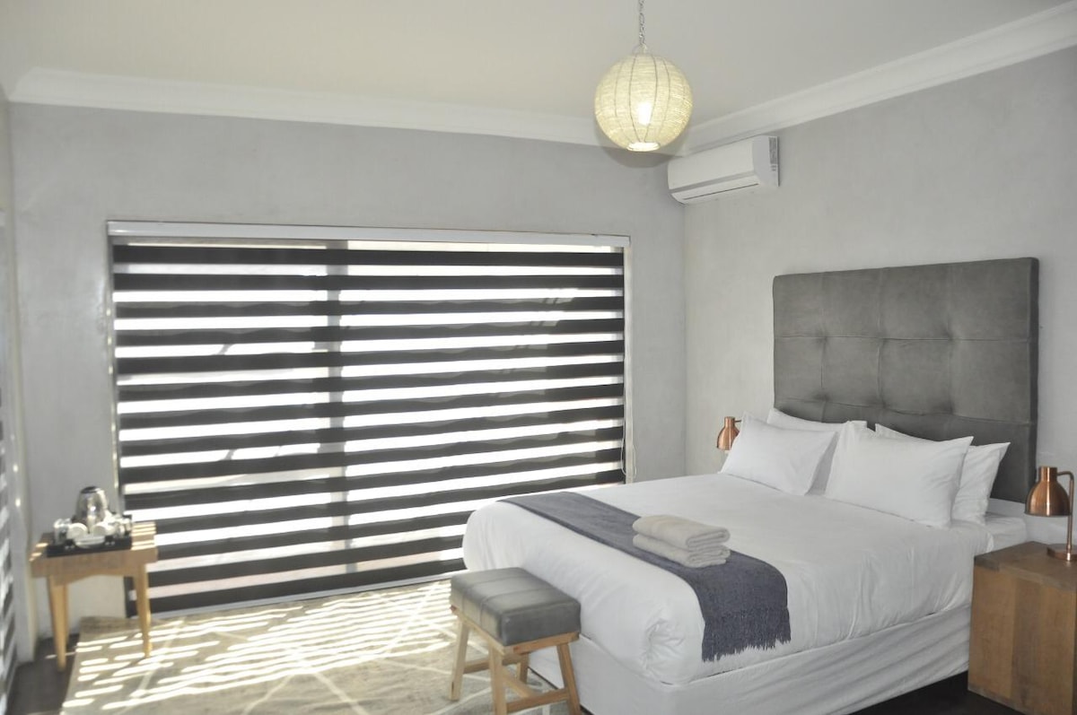 The chalet is furnished with a double bed, with the option of additional single beds, and has an en-suite shower. The air-conditioned chalet offers a TV with DStv, a bar fridge, and tea and coffee facilities. Wi-Fi and a workstation are also available.