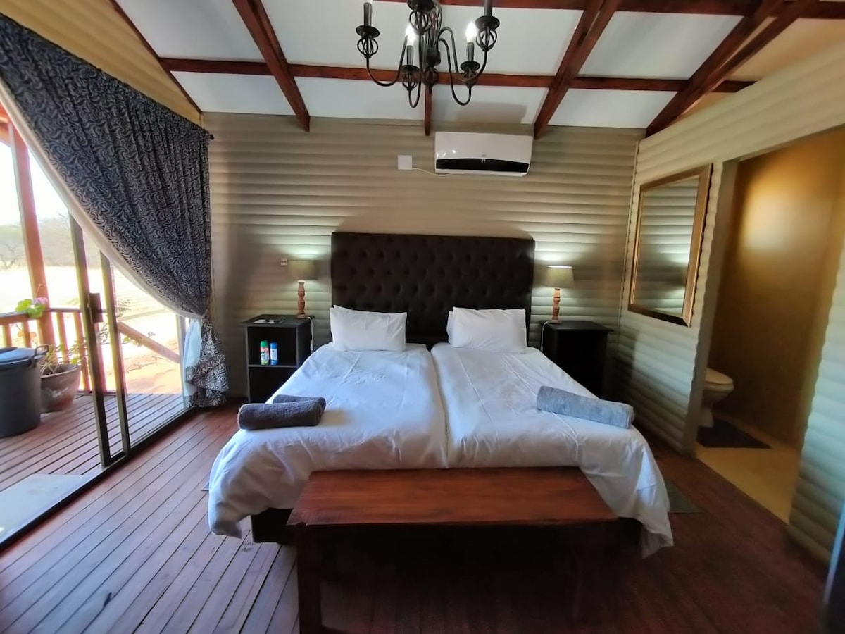 The chalet is furnished with a double bed, with the option of additional single beds, and has an en-suite shower. The air-conditioned chalet offers a TV with DStv, a bar fridge, and tea and coffee facilities. Wi-Fi and a workstation are also available.