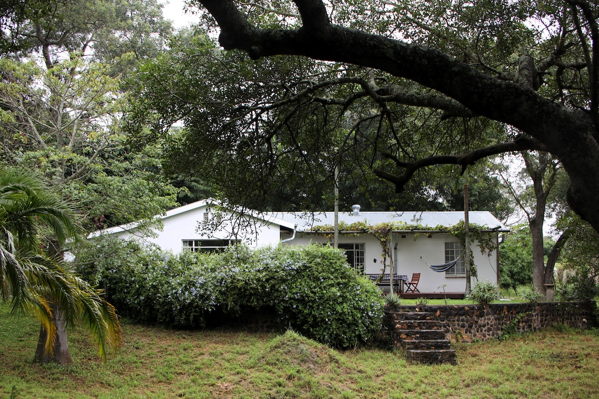 A charming spacious farm cottage with 2 ensuite bedrooms. An open-plan kitchen and living area flows onto a deck with a gas braai (BBQ) overlooking a tributary of the Timbavati river. Wandering around the farm you may bump into giraffe, zebra and other wildlife. There are extensive vegetable gardens and a fruit orchard providing a wide variety of organic produce. There are also ducks, geese, laying hens, bantams and other poultry. Fully solar powered so no electricity outages or blackouts.