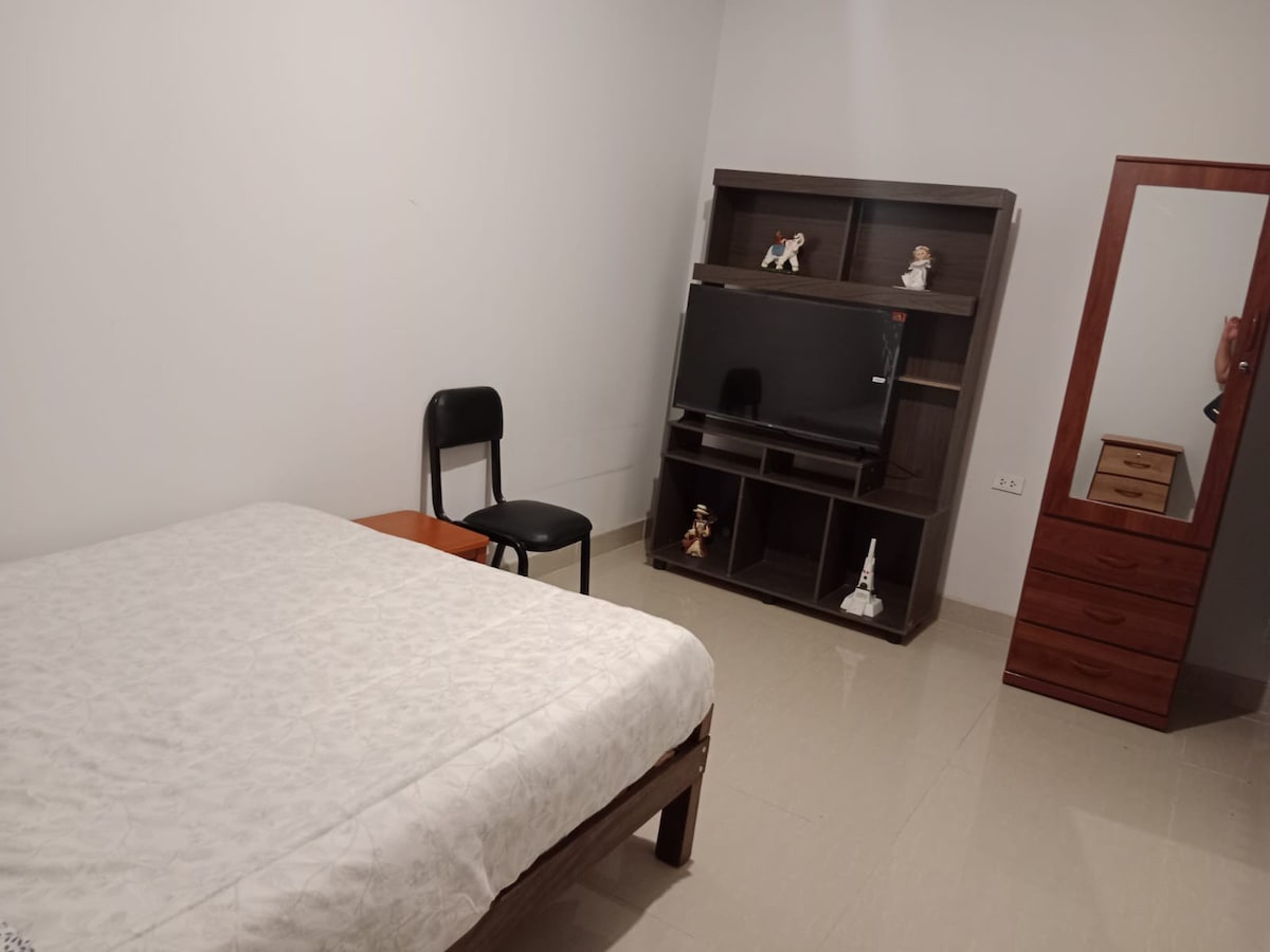 Bonito departamento, espacioso ,familiar, ubicado en el centro de la ciudad . 2 cuarto, 1 baño,lobby ,cocina totalmente equipadas para su uso,lavandería y patio,con agua caliente tv cable ,wifi.