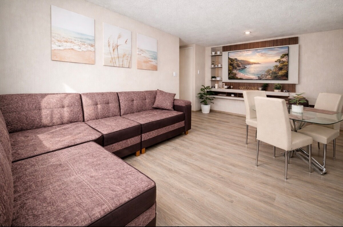 Bonito departamento, espacioso ,familiar, ubicado en el centro de la ciudad . 2 cuarto, 1 baño,lobby ,cocina totalmente equipadas para su uso,lavandería y patio,con agua caliente tv cable ,wifi.