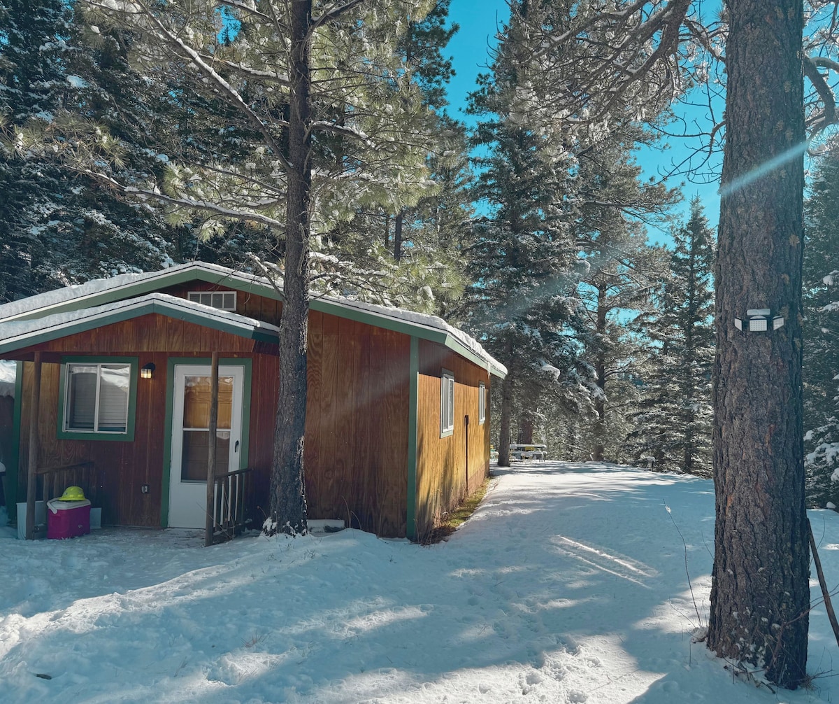 Escape to this cozy, hand-crafted tiny cabin nestled in the woods of Northern New Mexico. Overlooking a peaceful meadow with free-ranging chickens, turkeys, and ducks, this lovingly converted shed offers a full bed, kitchenette, a nighttime chamber pot, private deck, and fire pit. A clean outhouse is nearby, and a beautiful electric heater keeps you warm for winter. Perfect for writers, couples, and nature lovers seeking a quiet, rustic retreat. Don't feel like cooking? Pre-order a hot meal!
