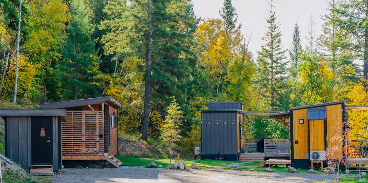 Modern tiny home, surrounded by mountains in the Canadian Rockies! Soak in the hot tub, relax in the treehouse sauna or on the spacious deck. ️ Perfectly located for adventure: 6 minutes to downtown Golden 20 minutes to Kicking Horse mountain resort Easy access to Yoho, Glacier, Banff, and Bugaboo Parks Queen bed + pull-out couch Modern kitchen with everything you need to cook Full bathroom with shower High-speed WiFi Shared hot tub and treehouse sauna Private deck with BBQ