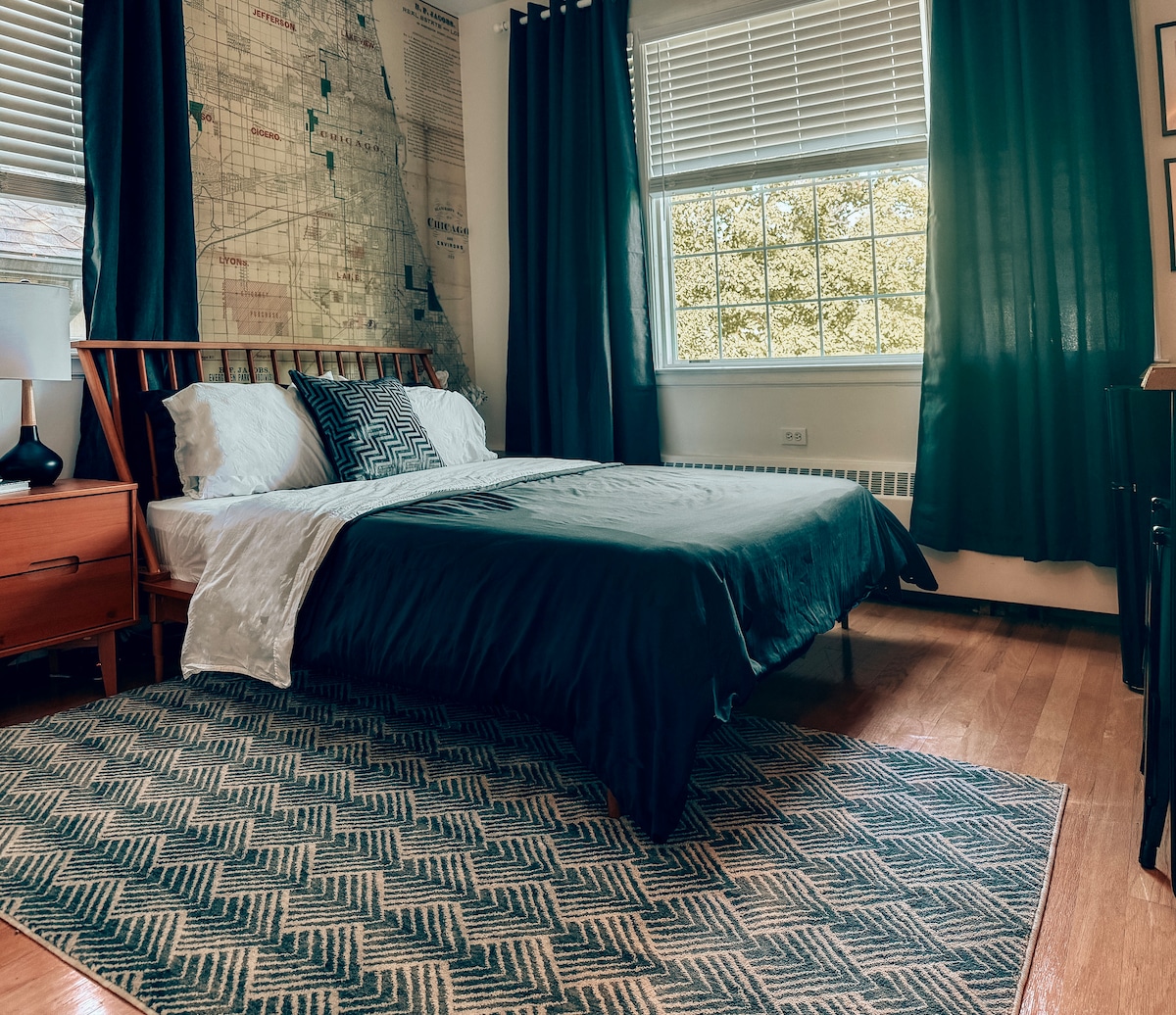 Our 1 bedroom + den apartment is peaceful & stylish for your monthly living needs. Very quiet building, 2nd floor apartment with no neighbors above or below. Centrally-located 2 blocks from UP-N Metra, the apartment includes: stocked kitchen (no dishwasher), free shared laundry, free overnight parking (must provide license plate), and private sleeping on a king-bed with adjustable base. An additional twin bed may be added for guests (added fee).