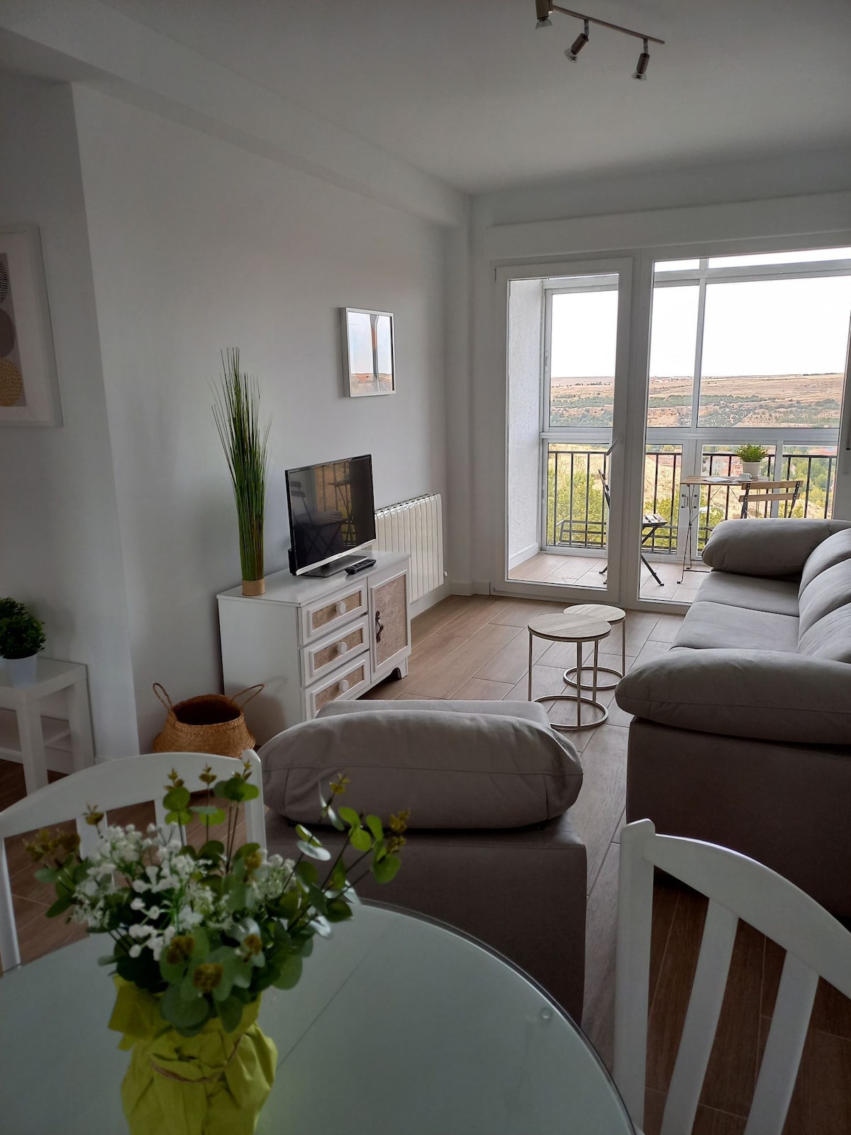 Piso totalmente reformado muy luminoso y con vistas maravillosas de la ciudad de Segovia. Aparcamiento gratuito en la calle y a escasos 15 minutos paseando del acueducto. Espaciosa entrada, cocina grande, dos dormitorios cada uno con cama de 1.50 m, salón con sofá cama de 90 cm, dos baños completos con ducha y una acogedora terraza. Es un quinto con ascensor. Calefacción central y agua caliente por termo eléctrico. Bus y supermercado a 200 m. Prohibido fiestas y mascotas.