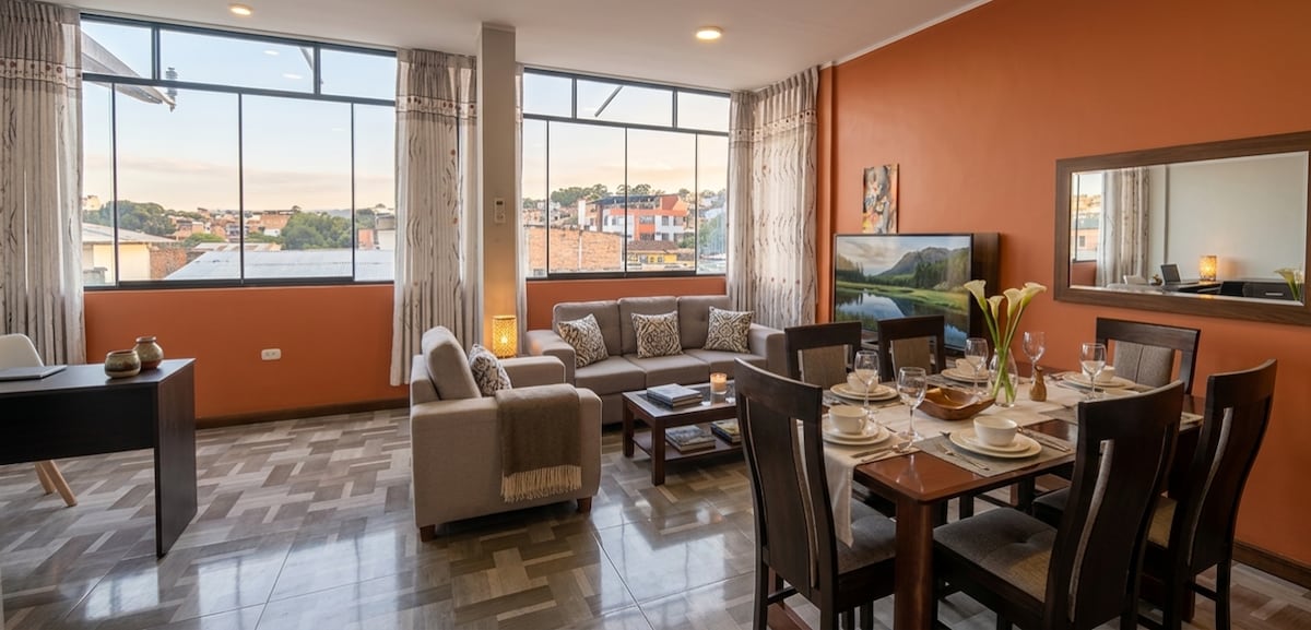 Departamento exclusivo de estreno con vista panorámica totalmente implementado para una estadía llena de confort y lujo. Se encuentra a solo 3 cuadras de la plaza central, cerca de restaurantes y todo tipo de negocios. Tendrás todo a tu alcance en una zona 100% segura. Contamos con AIRE ACONDICIONADO para que el calor de la ciudad no te sofoque y con una gran velocidad de internet para que siempre estés conectado.