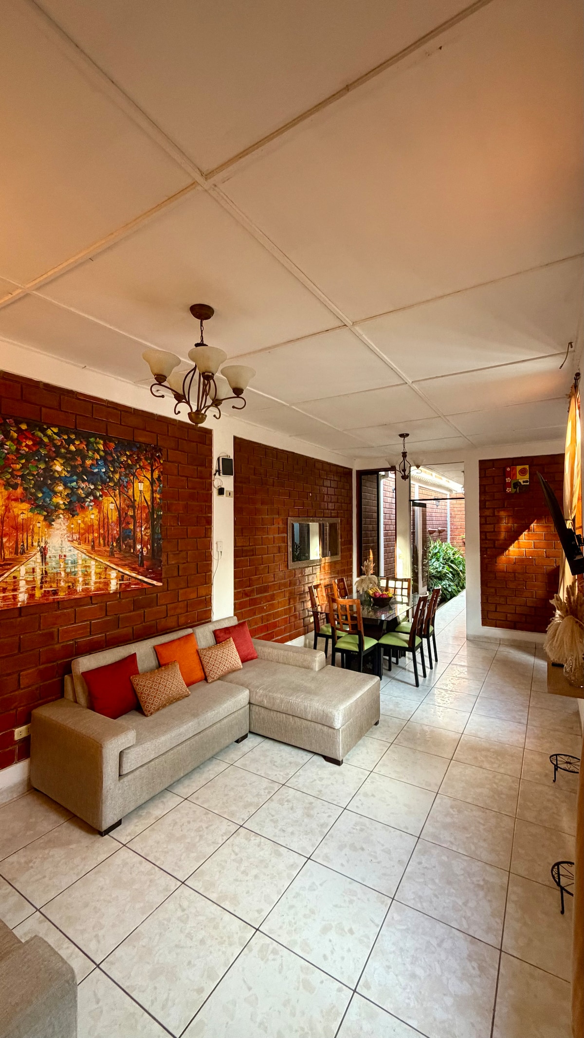 casa y jardin amplio y tiene un espacio y tapetes para hacer un pigning, es un ambiente abierto con decoración boho, área de oficina, de lavado y secado, cocina full equipada,2 cuartos ambos con tv Android, la cocina también tiene tv Android, la sala super acogedora, tiene ventilador. los cuartos también tiene ventiladores grandes y decoración tiene dos baños completos. vive una gatito, esta esterilizada tiene sus vacunas es para evitar presencia de insectos o roedores dado que hay el jardín.