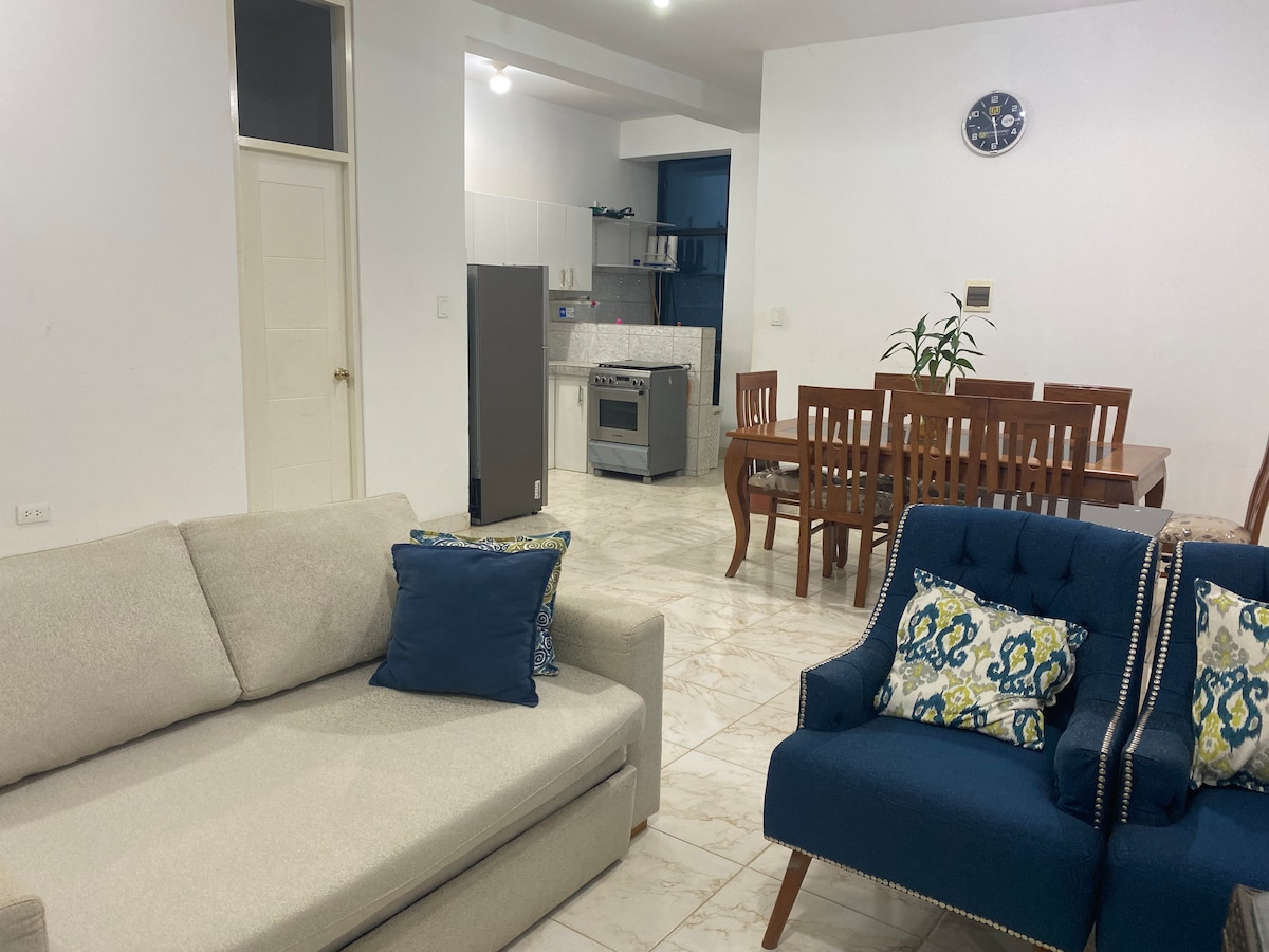 Departamento de ESTRENO en el centro de Tarapoto. Tranquilo y seguro Ideal para 5 personas con entrada independiente y totalmente amoblada. El departamento cuenta con los servicios de AIRE ACONDICIONADO , Wi Fi , cocina equipada, baños y lavandería . estamos a 8 cuadras de la Plaza de Armas de Tarapoto y con acceso rápido a los restaurantes, farmacias , Mercado y lugares de esparcimiento.