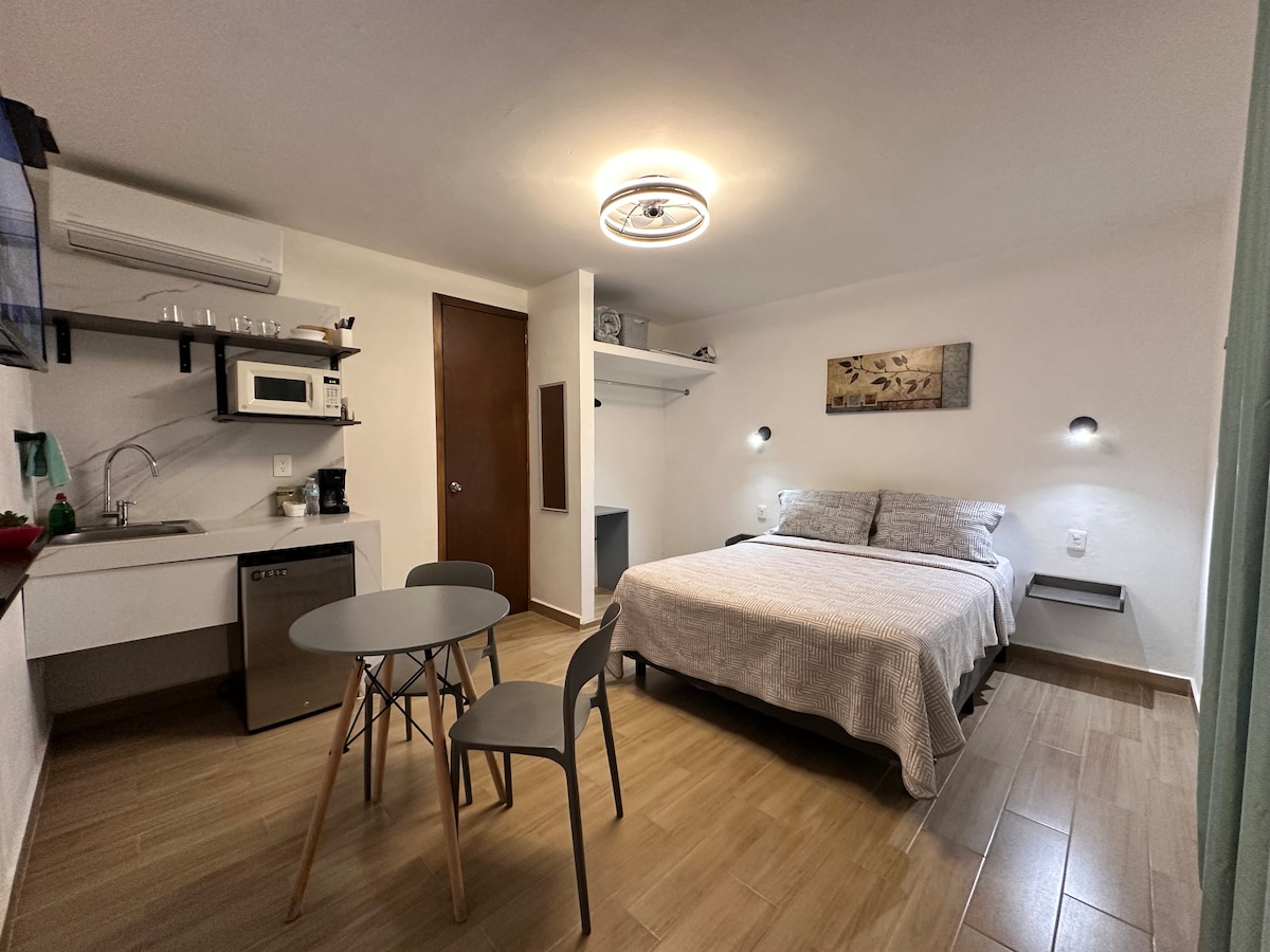 Pequeño alojamiento con excelente relación calidad-precio. Planta baja, entrada independiente, baño privado y cochera. Incluye cama matrimonial, baño completo, escritorio, silla, televisión con acceso a plataformas digitales, computadora, frigo bar, microondas, calentador de agua para café o té, calentador para el cuarto, mini split e internet de alta velocidad Wi-Fi o Ethernet. Ubicado en una colonia residencial tranquila y segura, bien comunicado con las principales avenidas de la ciudad.
