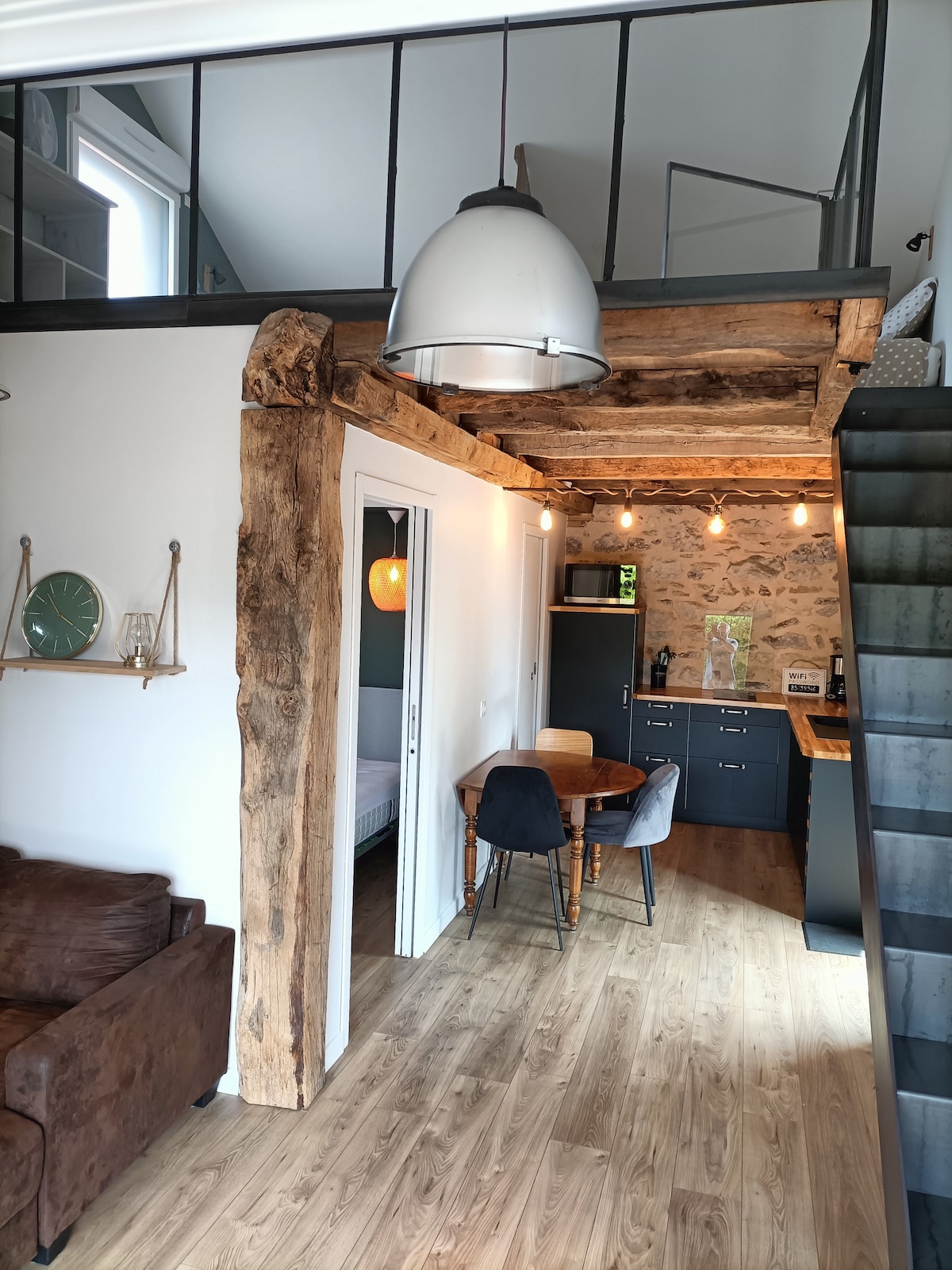 Ce logement situé à 20 minutes des portes d'Angers offre un accès facile à tous les sites et commodités. Il est également situé favorablement à 35 minutes du Zoo de la Flèche. Ce logement comporte une chambre en mezzanine, placard, bureau avec accès par une échelle de meunier. Au rez-de-chaussée WC, meuble vasque et douche. Kitchenette avec plaque électrique, réfrigérateur, cafetière, quelques accessoires de cuisine, tv avec chaînes de base , wifi et canapé.