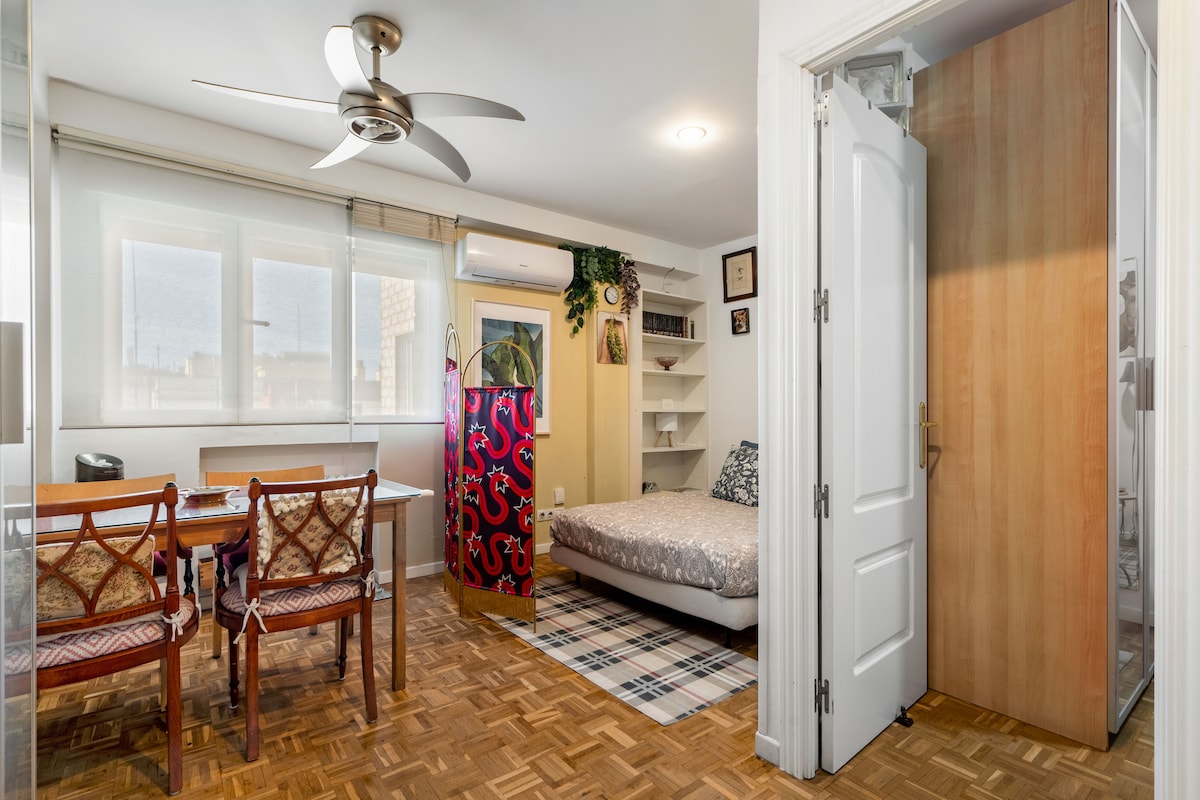 Independent room on the ground floor with an exterior window at street level. It has a kitchenette and a private bathroom. This space is not shared. The entrance and exit are shared in the hall. This is not a tourist rental. It is rented temporarily for work, teaching, or leisure purposes. Conveniently located in a well-connected area, close to supermarkets, restaurants, and shops. It is close to museums, El Buen Retiro Park, Atocha Station, and the 203 Airport Express bus.