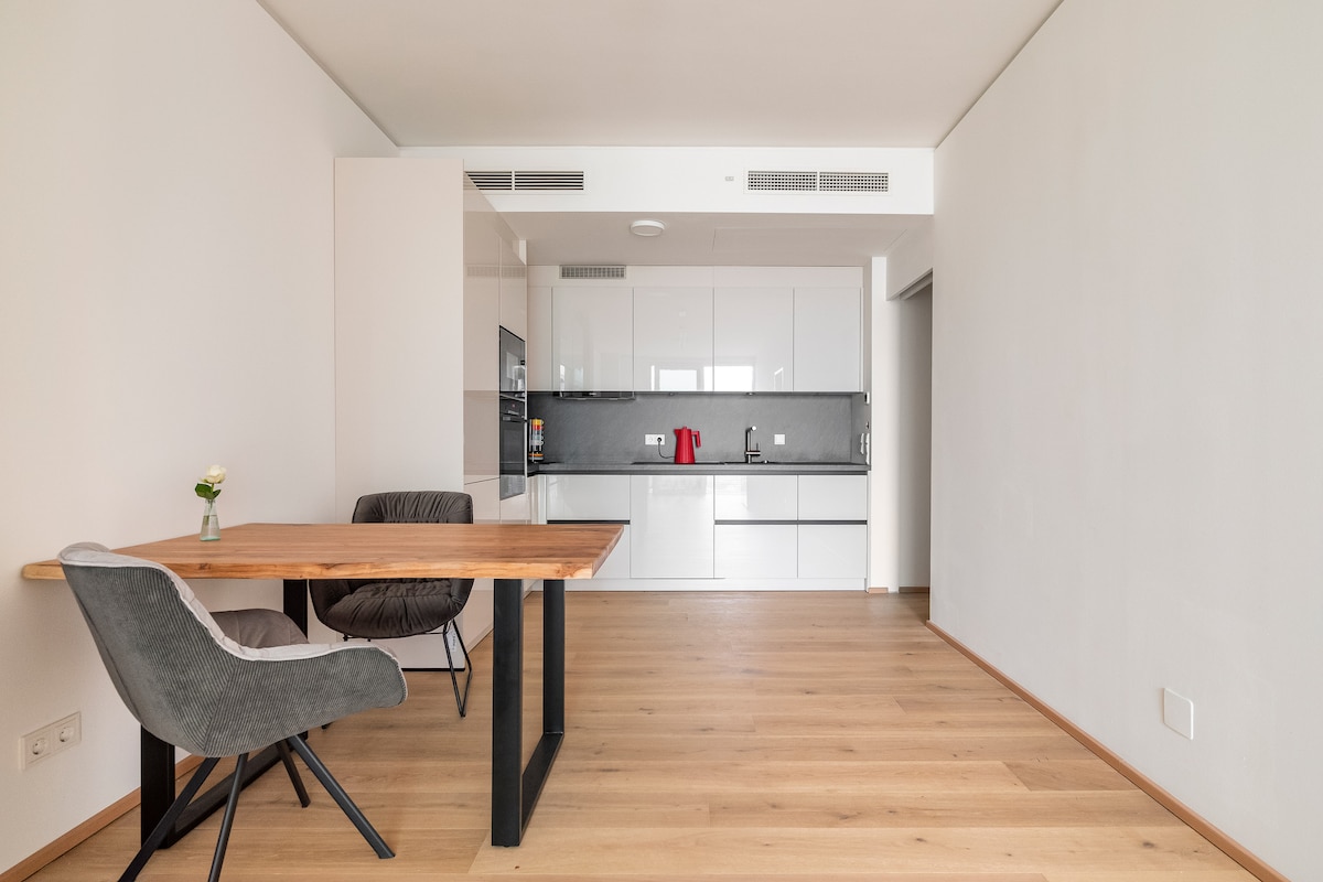 This designer apt on the 13th floor of the Sky Park residence by Zaha Hadid with panoramic view of Bratislava downtown will make you fall in love with the city. You can have your morning coffee on the terrace of the apartment or enjoy the view from the observation deck in 120m hight. Situated next to the Danube promenade, two shopping malls and just 10 min walking from the historical centre makes it perfect start point for the downtown explorer.