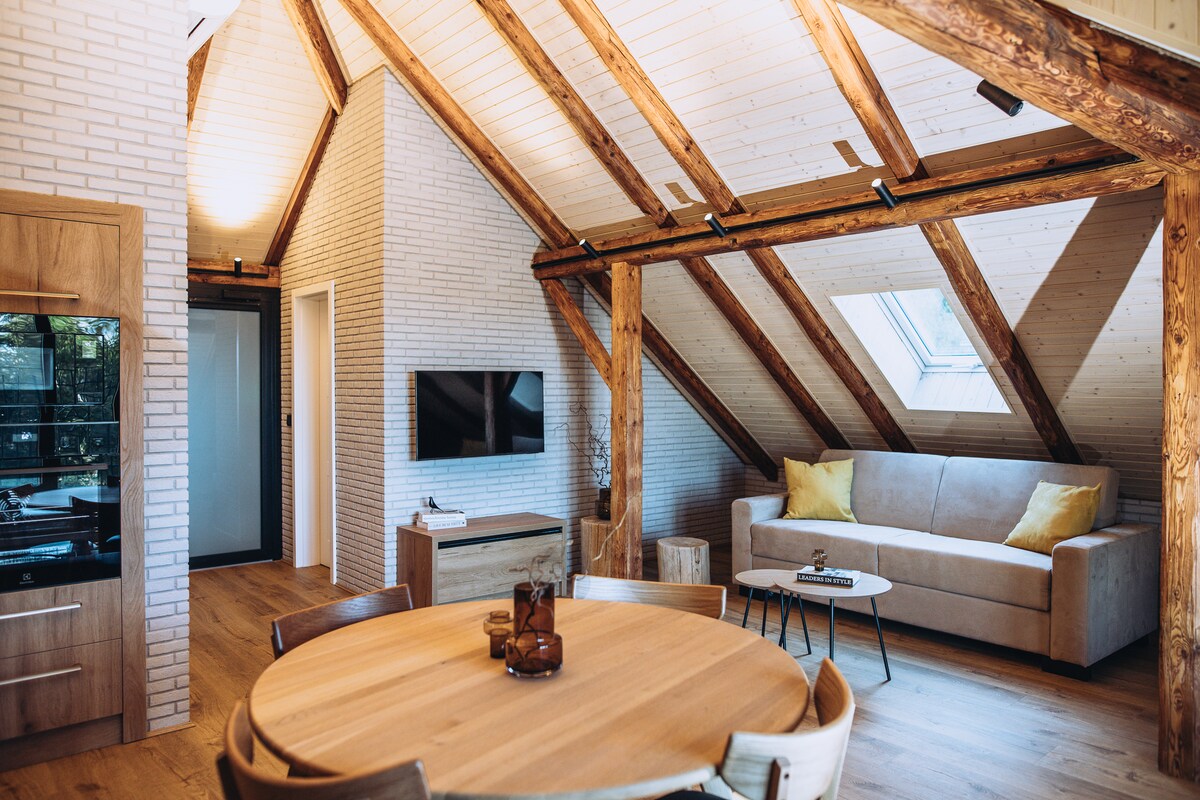 Moderně a útulně zařízený interiér v podkroví s plně vybavenou kuchyní. K dispozici je smart TV s přístupem na Netflix, Nespresso kávovar, pračka a Wi-Fi zdarma. Soukromé parkování je zajištěno přímo u domu, s možností dobití elektromobilu na dobíjecí stanici. Domácí mazlíčci nejsou povoleni. Ubytovací kapacita 6 hostů (1 manželská postel v ložnici, 1 rozkládací pohovka pro 2 hosty v obývacím pokoji, 1 rozkládací lavice v obývacím pokoji)