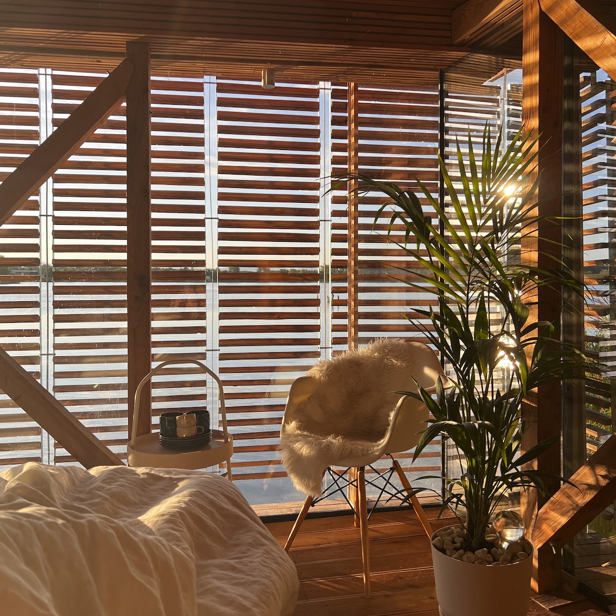 Zažite romantický východ slnka nad jazerom, alebo nerušene pozorujte vodné vtáctvo z bezprostrednej blízkosti a ak chcete z pohodlia postele:) Ateliér na jazere je pôvodne ateliér architekta - autora objektu. Pracovnú funkciu ateliéru teraz vystriedala funkcia rekreačná a poskytuje možnosť ochutnať výnimočnú architektúru v malom objeme, osadenej tesne nad hladinou jazera aj vám. S oblou zadnou stenou Ateliéru a v mäkkých perinách sa budete cítiť ako v útulnom peliešku:)