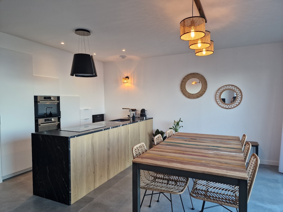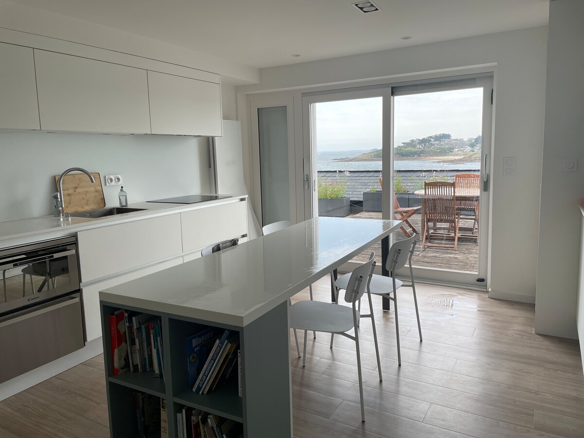 Unique ! Design beach house in Morbihan in Brittany! Direct access to the beach at the end of the garden, The house is new, fully equipped and you are the only occupants of the premises, Direct view of the beach / the sea from the living room, the kitchen, the terrace, the roof terrace and one of the bedrooms upstairs. Sheets, towels and cleaning included, washing machine and dryer. Many activities nearby: walks, cycling, sea kayaking, kite-surfing, tree climbing, cultural visits, boating...