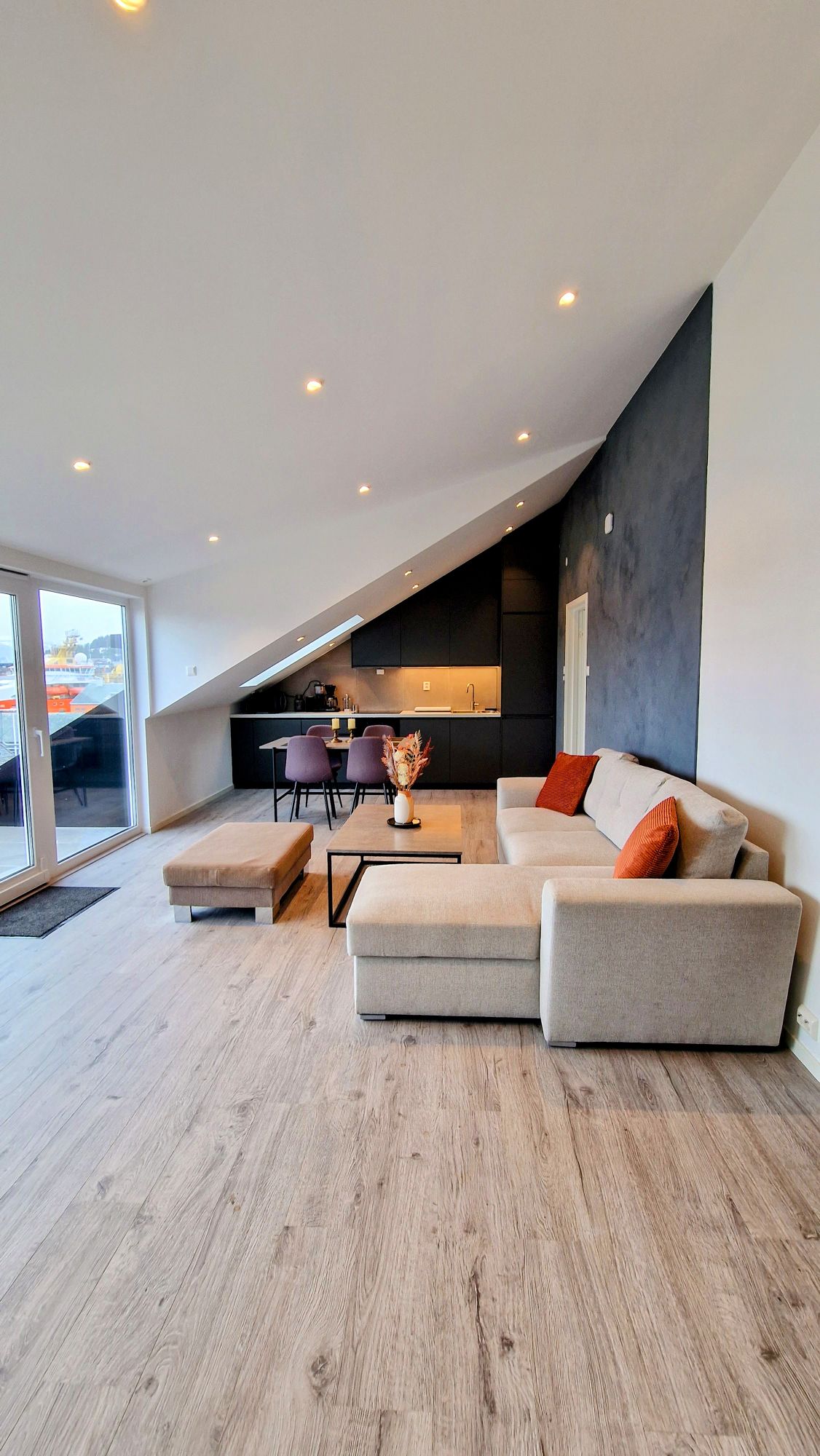 The apartment features one bedroom with a 150 cm double bed, as well as a loft space. The bedroom has a smal working desk with a 24 inch Samsung screen. The kitchen is equipped with a small dining table, and the living room includes a TV with channels and streaming apps and free Wi-Fi. Please note: the apartment is located on the 4th floor with no elevator, and reaching it from the city center requires walking up a very steep 200-meter hill. Electric car charging and parking is available.