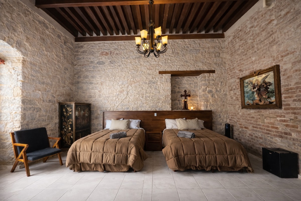 Amplio espacio tipo Loft en Casona Origen Habitación de dos pisos en la que encontraras comedor y sala en la planta baja. Una cama matrimonial, litera con colchón queen size y dos individuales. Cuenta con BAÑO PRIVADO FUERA de la habitación, a escasos 10 pasos. Tv, Wifi, Secadora, Toallas, amenidades baño. El espacio no cuenta con estacionamiento propio. Se tiene convenio con el estacionamiento mas cercano a la Casona.