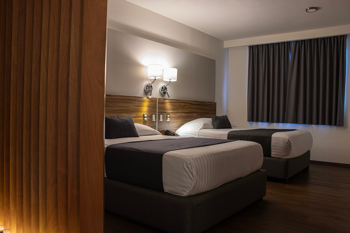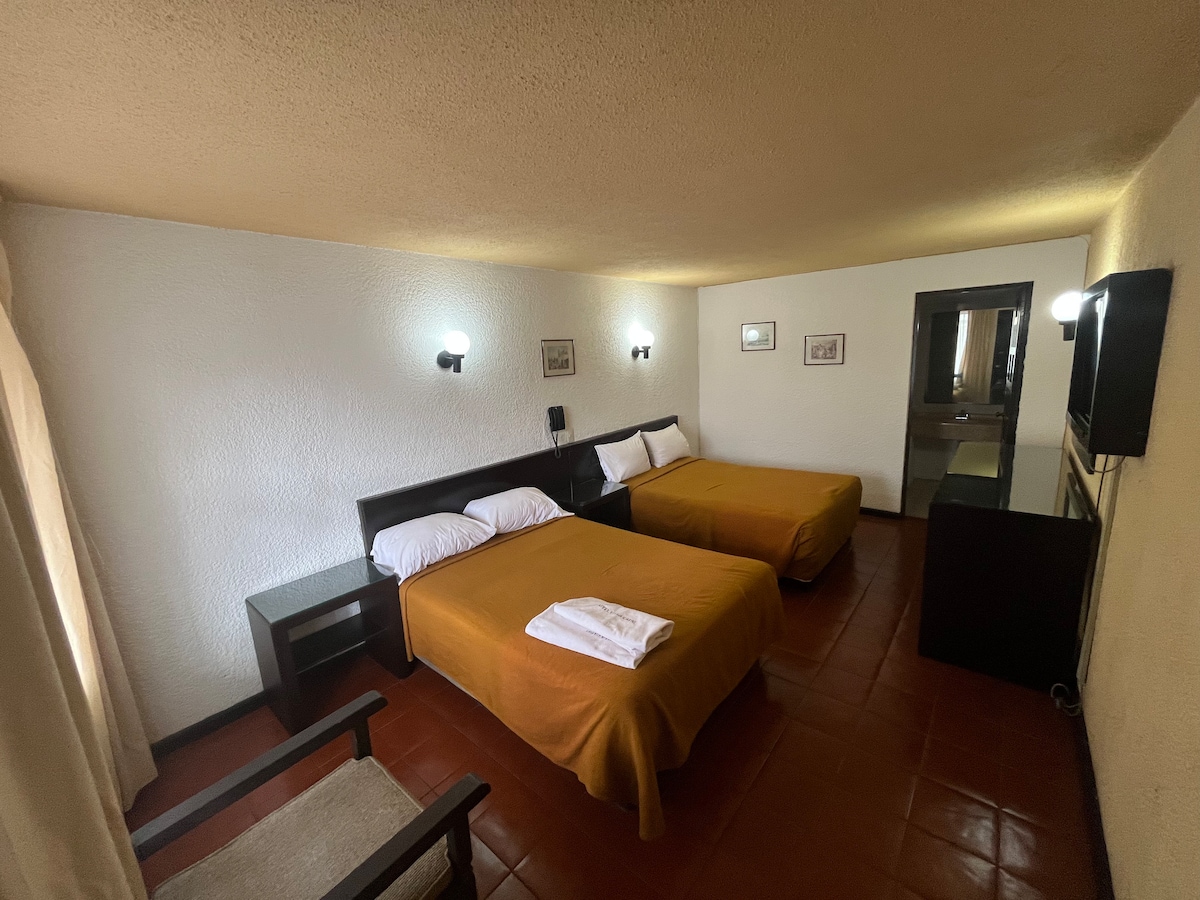 Habitación amueblada con 2 camas Queen, smart tv, con vistas al patio interior, adaptada para personas con capacidades diferentes (sin escalones, barras de apoyo en wc, banco en regadera). Disfruta de una noche cómoda y acogedora en el centro de Morelia. A 50 pasos de la Av. Madero (avenida principal)