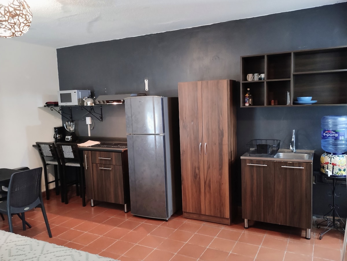 El Loft cuenta con cama tamaño KING SIZE (buen colchón), TV de 43", closet, sala y cocineta con parrilla de inducción, WIFI (60MEGAS), utensilios de cocina, vasos, platos, cubiertos, todo para poder preparar tus alimentos. El Baño cuenta con: -2 Toallas. -Jabón líquido. -Shampoo. La Habitación cuenta con un balcón que permite una buena ventilación y tiene VISTA A CATEDRAL. El baño, cocineta, sala y cama son PRIVADAS. (no se comparten con nadie).