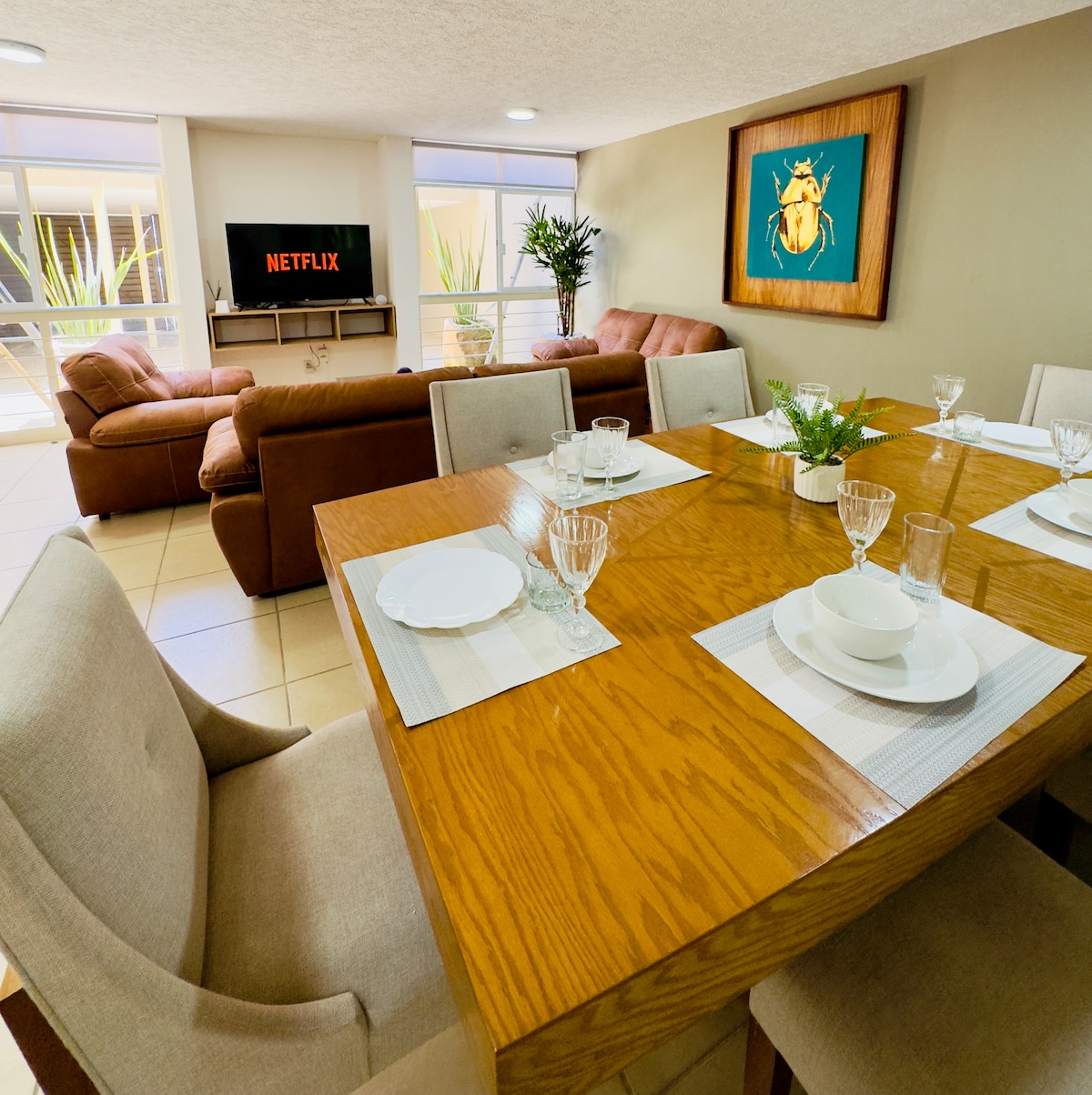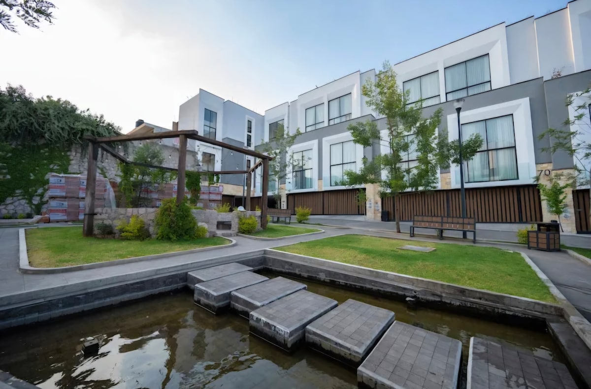 La mejor zona de la ciudad, excelente ubicación. Lugares cercanos: Restaurantes, centros comerciales, Gym y zona bancaria, además de estar a tan solo 10 minutos del centro histórico 2 habitaciones (King/Queen) cada una con baño completo, sofá cama con colchón individual en sala Cocina equipada, sala comedor y acogedora terraza 2 Cajones de auto pequeño en linea Wifi/Netflix/HBO/Star+
