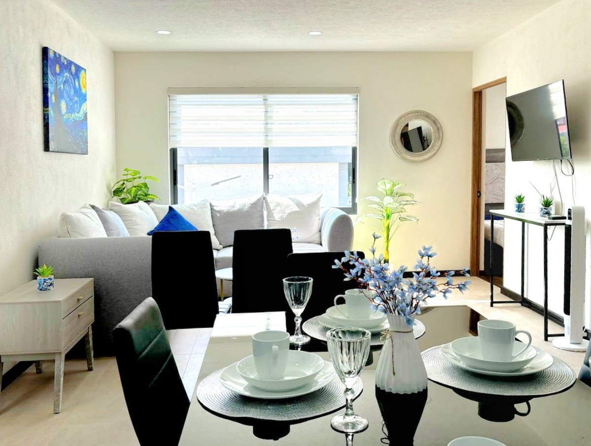 La mejor zona de la ciudad, excelente ubicación. Lugares cercanos: Restaurantes, centros comerciales, Gym y zona bancaria, además de estar a tan solo 10 minutos del centro histórico 2 habitaciones (King/Queen) cada una con baño completo, sofá cama con colchón individual en sala Cocina equipada, sala comedor y acogedora terraza 2 Cajones de auto pequeño en linea Wifi/Netflix/HBO/Star+