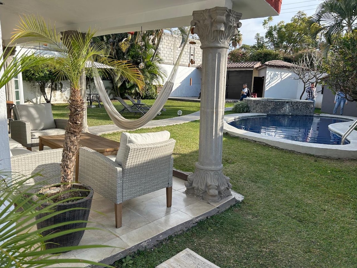 Increíble casa en una de las mejores zonas de Cuernavaca. En esta casa se respira la tranquilidad. No hay ningún ruido del exterior, más que los de la naturaleza. Cuenta con un hermoso jardín y una amplia área de piscina con camastros. La casa está completamente equipada con aire acondicionado, wifi, televisión, netflix, etc. Es el lugar ideal para relajarte!! Dentro de la propiedad hay otra casa, sin embargo son completamente independientes y se respeta la privacidad de cada una.