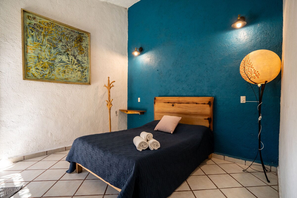 Céntrica habitación privada con magnífica vista a la montaña a unos minutos caminando del centro de Tepoztlán. Perfecta para 1 o 2 personas. Incluye una terraza común, jardín grande, baño privado, estacionamiento y asistencia hasta las 9 pm. Habitación doble.