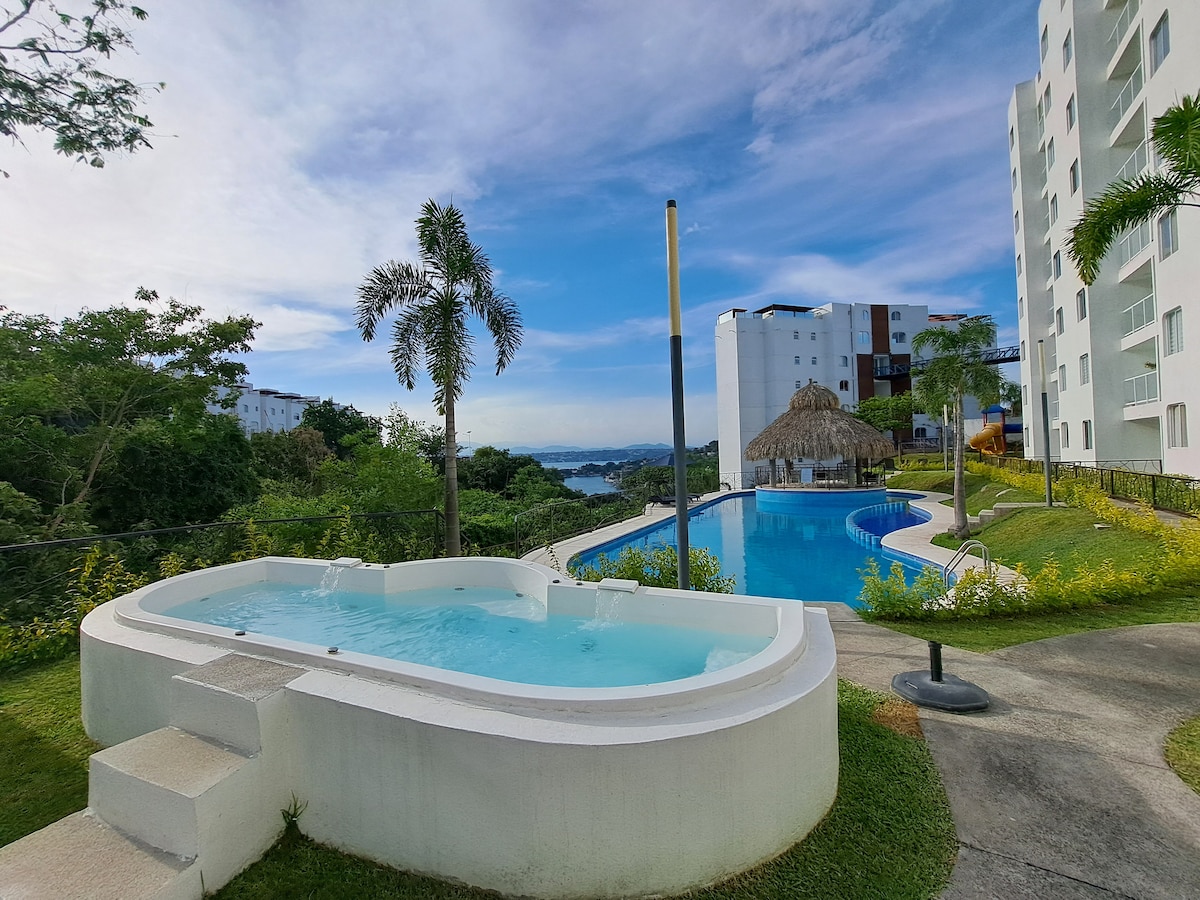 "Teques: Ground floor apartment, private garden, 2 bedrooms with triple bunk beds and shared bathroom, 1 master bedroom with bathroom, double bed, and private garden jacuzzi. Equipped kitchen, private charcoal grill (cleaning fee $250.00), steps away from the pool, palapa with sunbathing area, common jacuzzi, and playground. Private dock with additional services such as kayak, boat rides, water skiing, tubing, parachuting, and plane rides over the lake. Heated pool from Friday to Sunday."