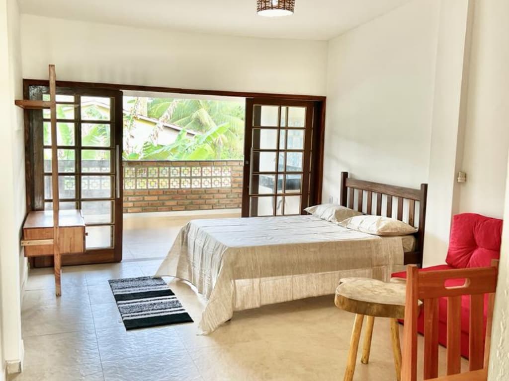 Casa aislada de 70 m2, totalmente equipada, entrada independiente, dentro de un área verde de 1.500 m2. Dos dormitorios, un baño, sala, cocina americana, terraza, zona de lavado. A 10 minutos caminando o a 3 minutos en cuadriciclo de las hermosas playas de Tassimirim y Cueira, 5 minutos caminando al centro de la Vilha, comercio en general, restoranes, puesto de salud y a 200 metros del punto de tractor y cuadriciclos. Smart TV, wifi y aire acondicionado. Ideal para trabajo a distancia.