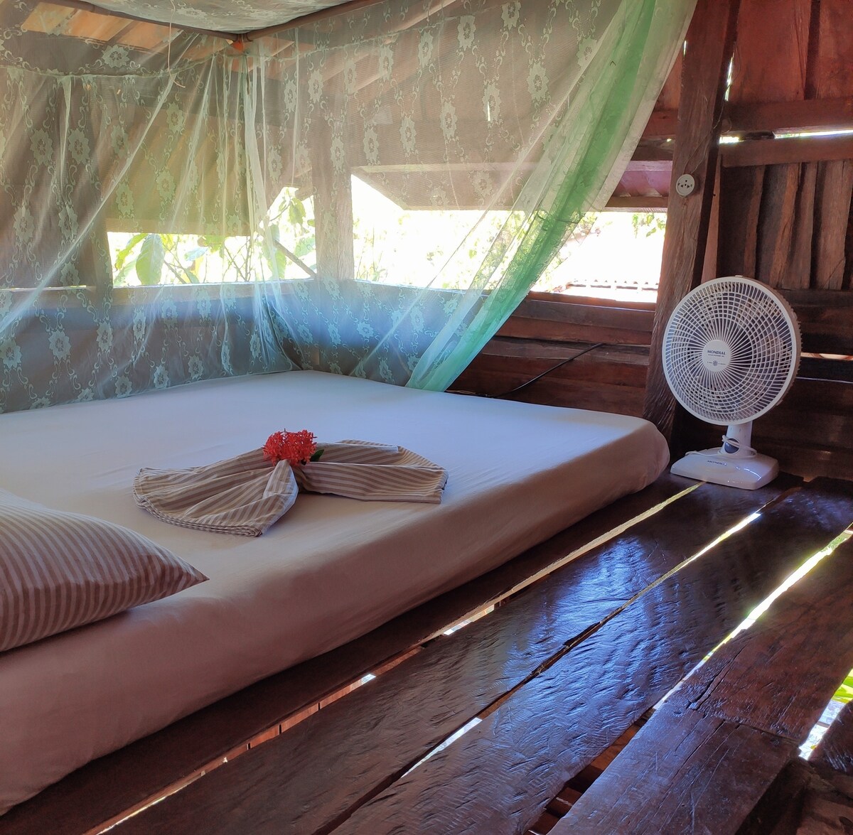 O chalé tem uma cozinha, banheiro, e um mesanino com um colchão de casal e um ventilador. O chalé ele é 100% de madeira reciclada. Boipeba por ser um local com mata próxima, carregamos a consequência de ter que lidar com muitos mosquitos. O chalé tem mosquiteiro e também ventilador. Mas por ser uma chalé com brechas é recomendado o uso de repelente quando estiver na cozinha e também na rede.O CHUVEIRO NÃO É ELÉTRICO. Se permita e esteja aberto a viver novas experiências. ✨