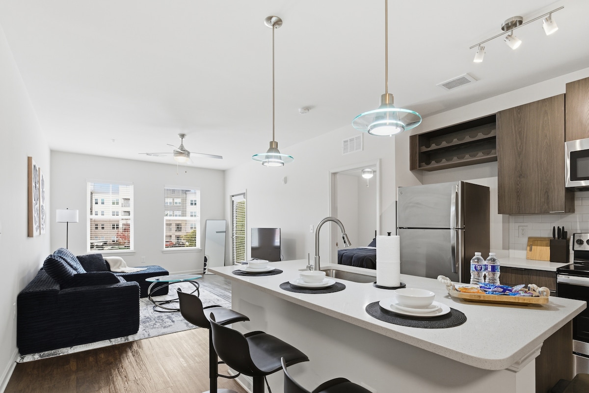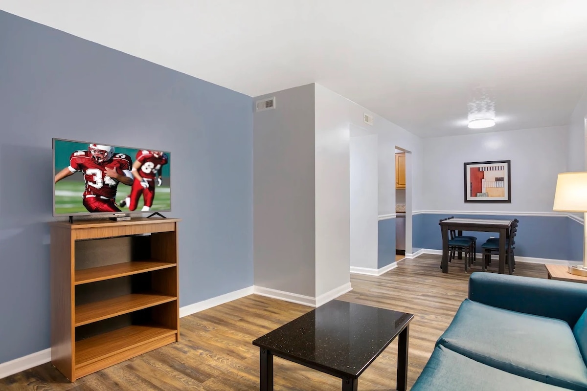 Our 2-bedroom 2-full bath apartment is furnished with a King bed in the primary room and Queen bed in secondary room with 43' smart TVs in both bedrooms. The common space has a 50' smart TV, dining table for 4, love seat, and 2 accent chairs. It has everything you need for a comfortable stay! The kitchen is stocked with cookware for meals, coffee, and tea maker to enjoy a fresh cup of coffee or tea. Anything in the apartment is yours to use. Make yourself at home once you arrive.