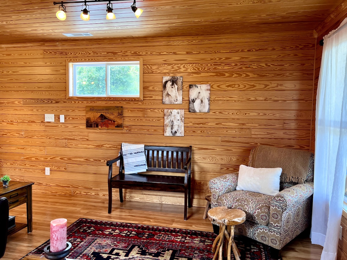 Discover this enchanting loft above the stable offices, with breathtaking views of horses grazing in pristine pastures and riding in the full-sized arena. This 600-square-foot sanctuary with full bath features a luxurious king bed, charming sitting area, and private deck perfect for soaking in the magnificent scenery surrounding you. Experience pure tranquility in this cozy retreat nestled in the heart of one of Georgia's most spectacular ranches!"