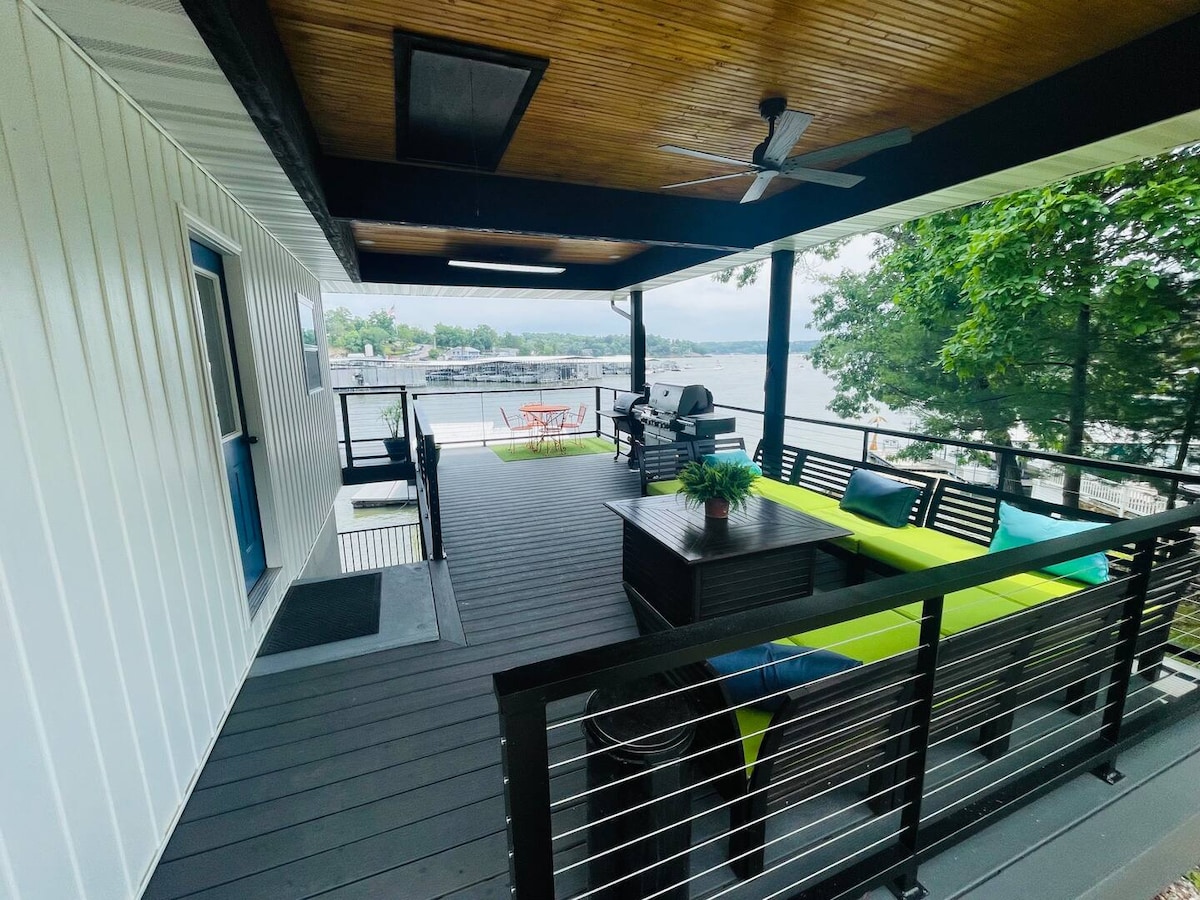 Entire lake house ready for your next lake retreat with family or friends. Spacious living area including outdoor deck space with a private dock and kayaks for use! Watch the sunset on the dock while grilling out or next to the gas fire pit. Cozy up next to the wood burning fireplace. **NEW LOWE Tritoon BOAT RENTAL option or space to side dock your boat. Close to the strip, grocery stores, and restaurants. Mini golf, go-karts, and a winery are also nearby. Perfect for a weekend or long get away.