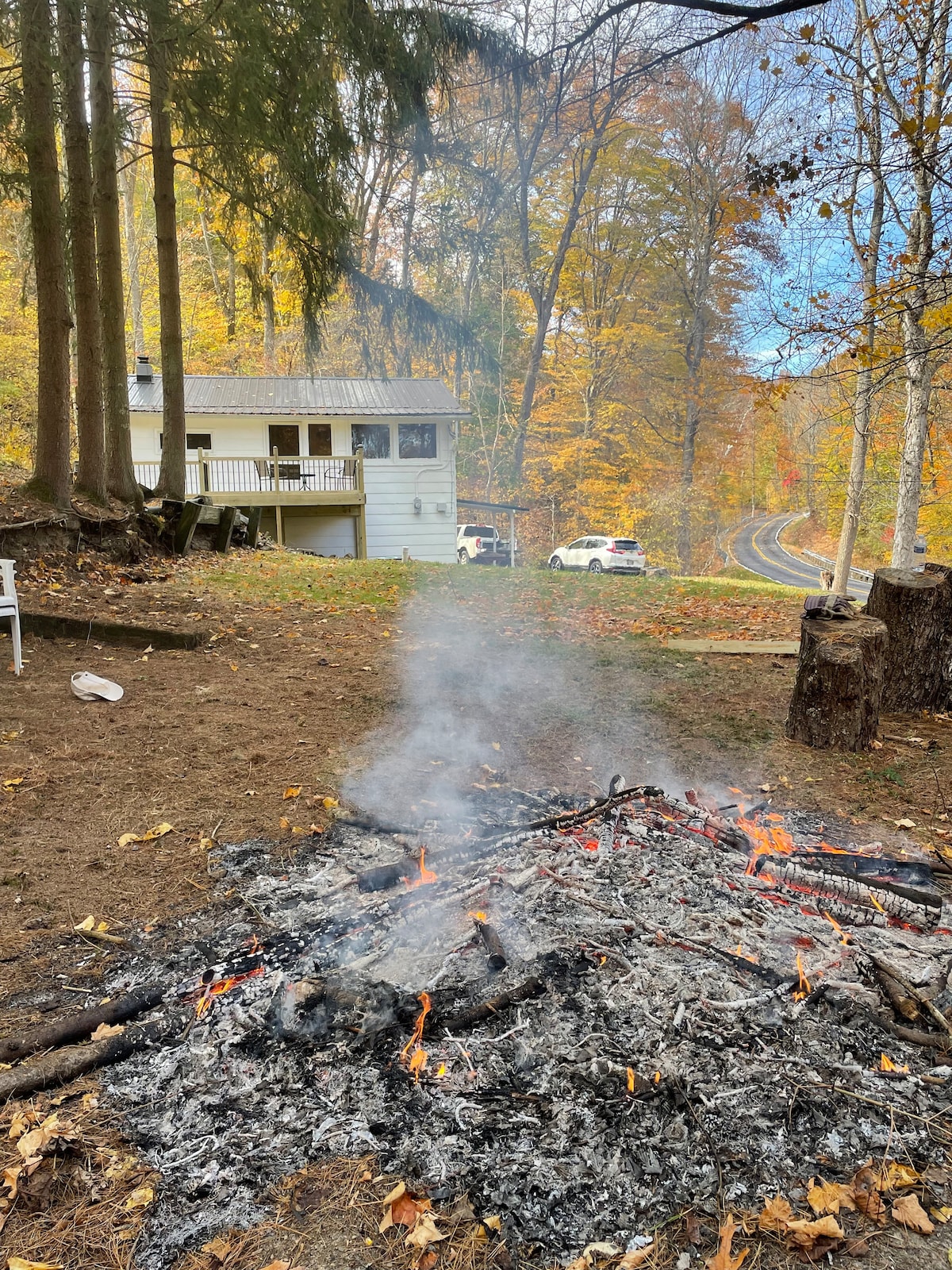 This is an eclectic space that was a former art studio. The artist who lives just next door, keeps a private working studio in the loft. Although it is inaccessible to our guests, you will see her art on the walls and her creative side in the large lady shown in the pictures. Firepit and wood available. 5 hiking trails on 300 acres! Nov7-Dec 7th we will have hunters and trails may not be available Important: please read the house rules before booking with pets. We do also have a pet fee.